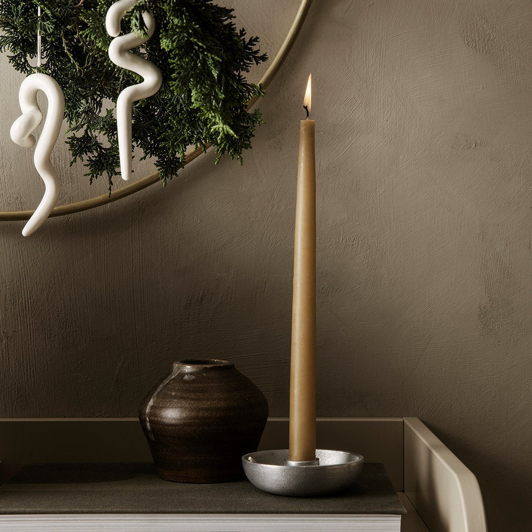 This candle holder has a simple, elegant form with a distinctive, rough and rich texture owing to the material of casted metal. Use the candle holder on its own or in the company of other candle holders in various heights to create a unified, cosy atmosphere.
