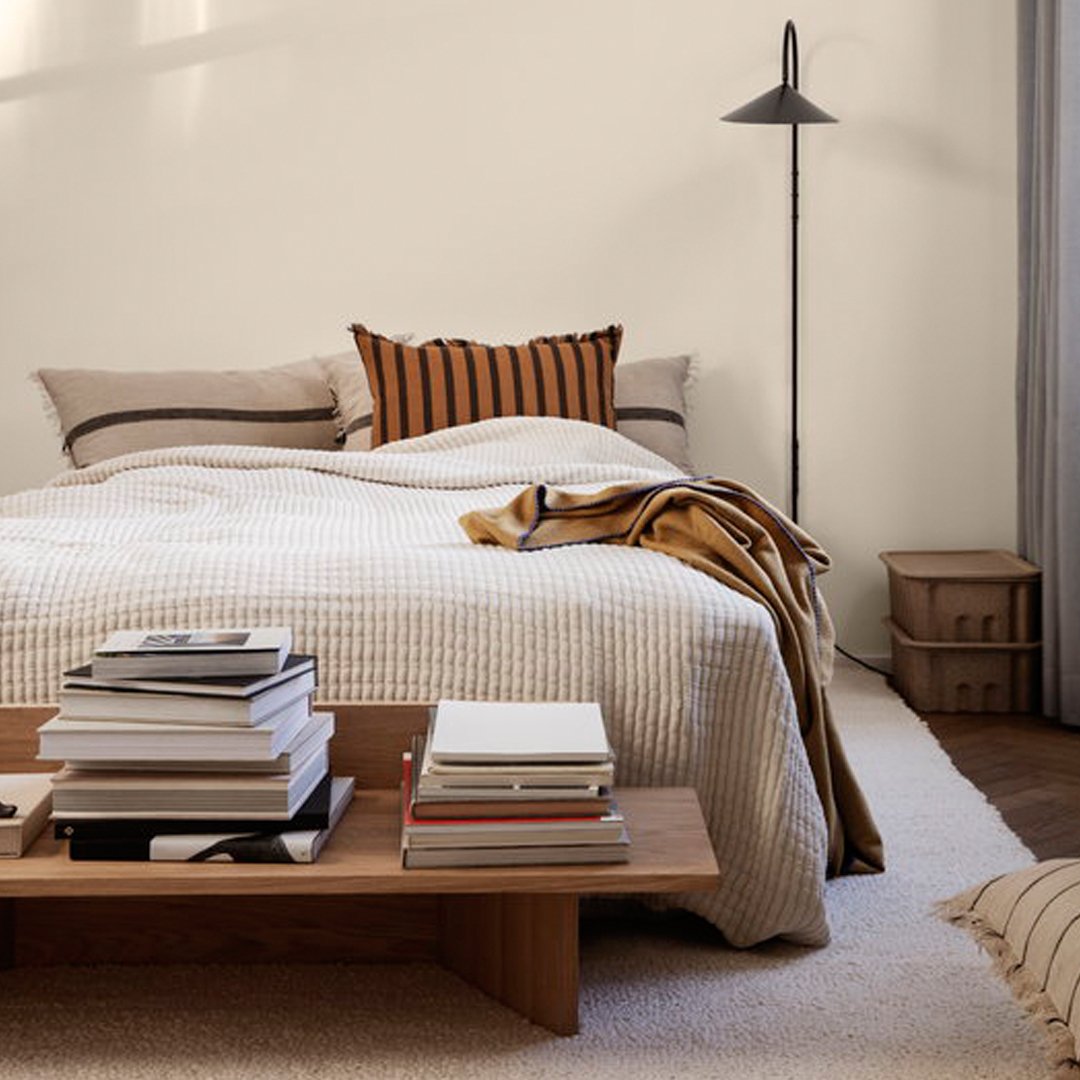 A taller version of our Arum Wall Lamp, this iteration has a slender silhouette, created from tubular, beige powder-coated metal that conceals a textile cord. A hybrid between a floor lamp and a wall light, the elegant beige design lends personality to a space, illuminating it with ambient light.