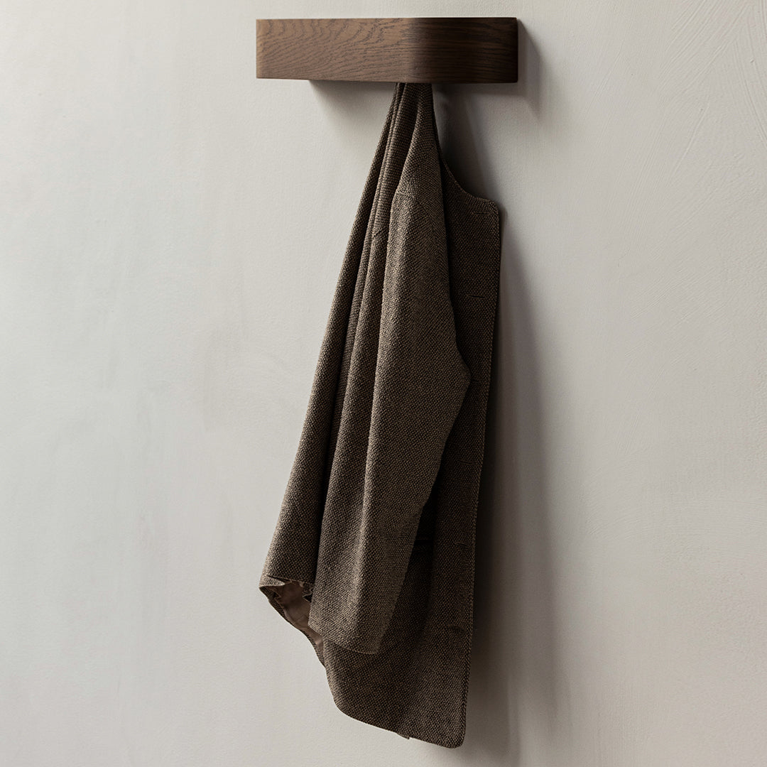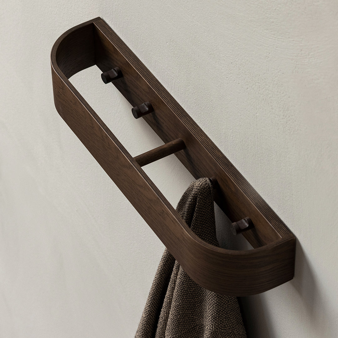 Clean lines, intuitive function and innate beauty define the Epoch Clothes Rack by Nina Bruun, one of two new designs from the Danish designer. Updating the ubiquitous coat rack and working from the idea of concealing unsightly hangers and tags behind something beautiful, the minimally elegant design profiles a considered combination of gently rounded edges, warm wood and discreet functionality. Developed and perfected over time, it is characterized by soft bands of undulating wood that sit like sculptures on a wall. Referencing 1950s design aesthetics and traditional craftsmanship, Epoch is pure in both form and material. Available in natural or dark stained oak, it is carefully sized to fit both purpose and place.