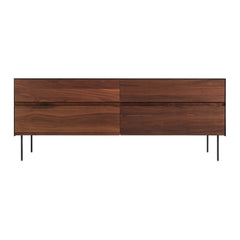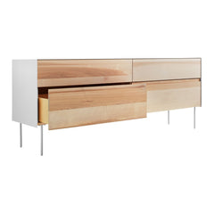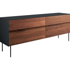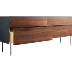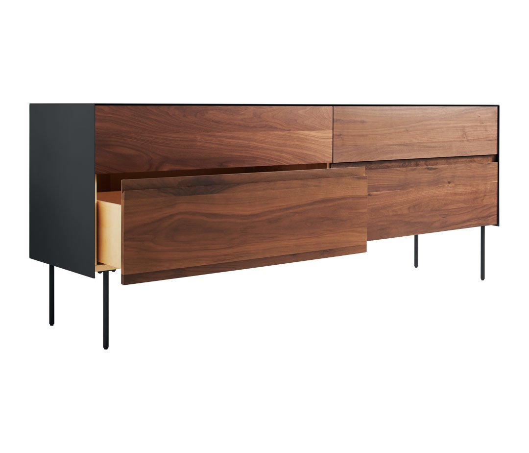 Sometimes we fall hard for a good mix of materials. Like beautiful, warm wood meeting the cool, smooth toughness of steel. This design marries wood drawers and doors with a powder-coated steel side, top and legs to form an alluring union. Integrated groove pulls and soft closure mechanisms on all doors and drawers.