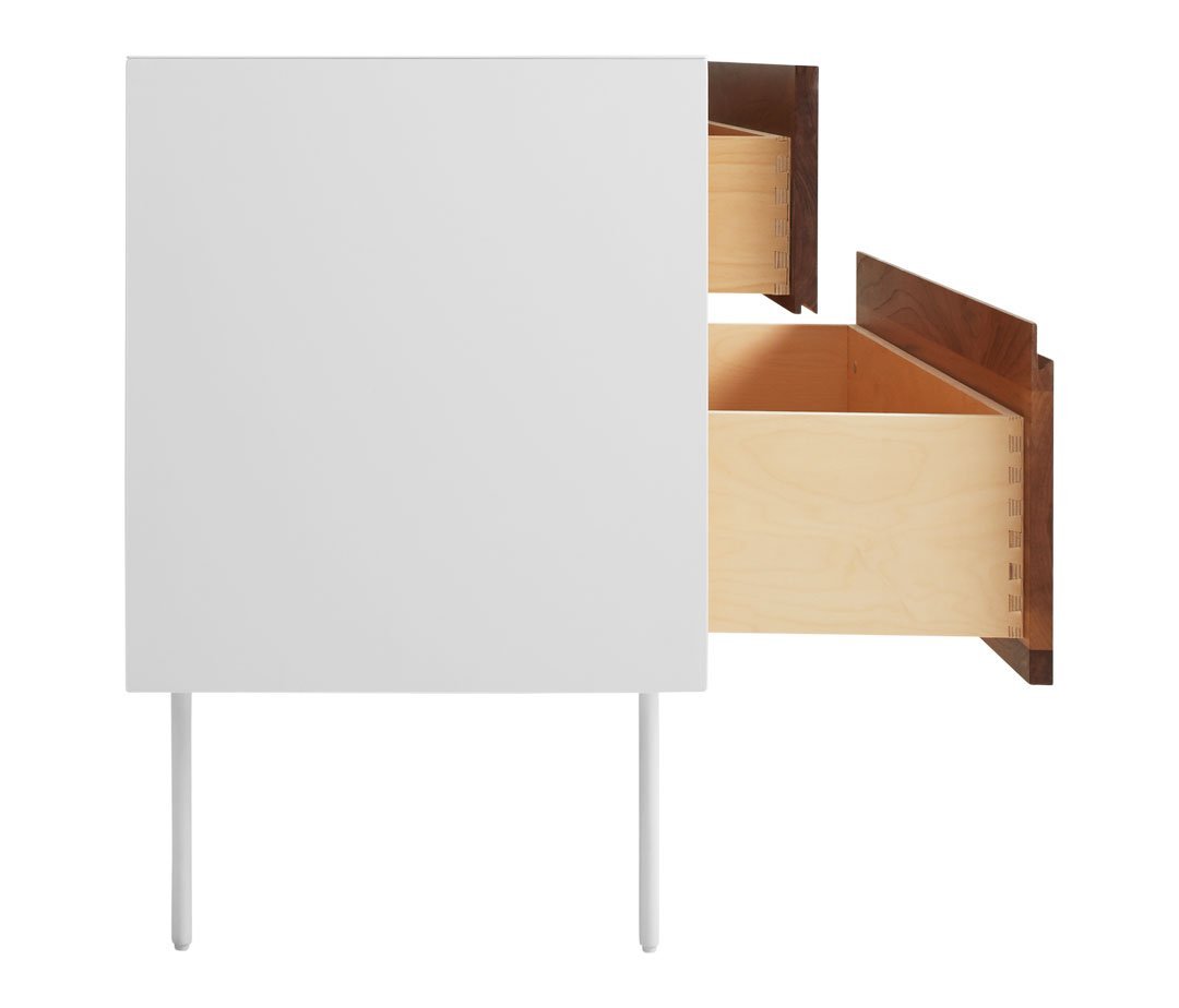 Solid wood drawer fronts. Powder-coated steel outer case with plywood interior. Powder-coated steel legs with nylon foot glides.