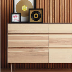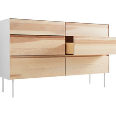 Sometimes we fall hard for a good mix of materials. Like beautiful, warm wood meeting the cool, smooth toughness of steel. This design marries wood drawers and doors with a powder-coated steel side, top and legs to form an alluring union. Integrated groove pulls and soft closure mechanisms on all doors and drawers.