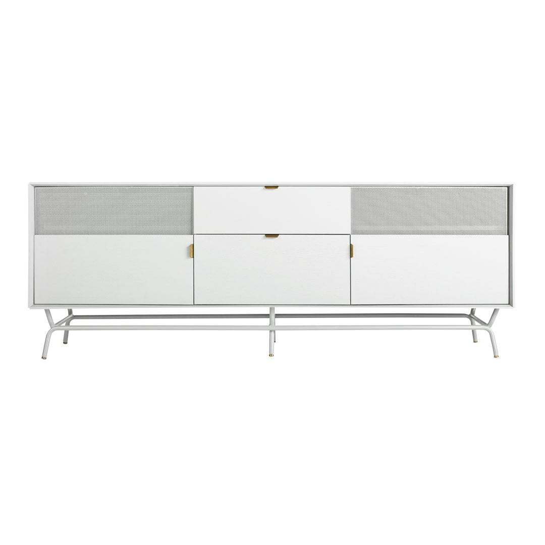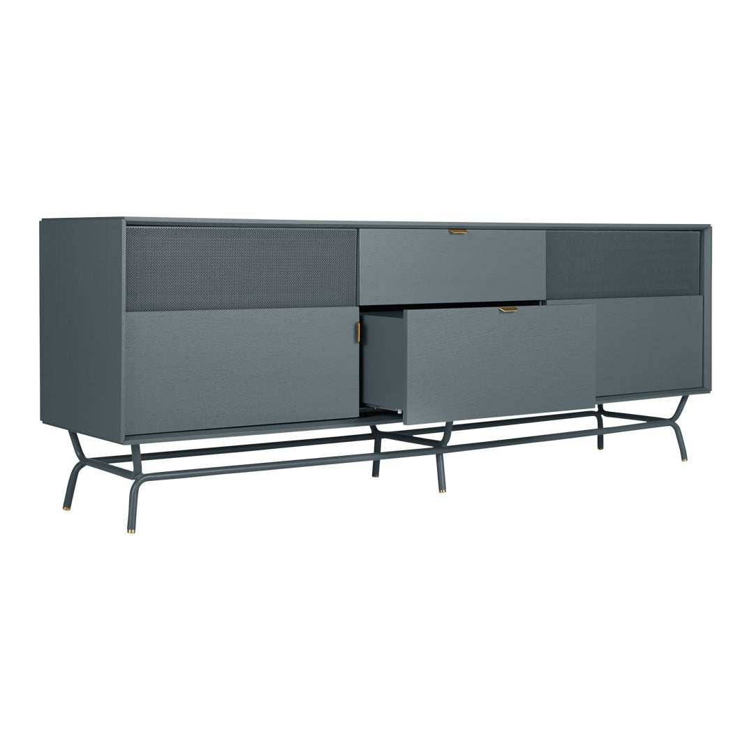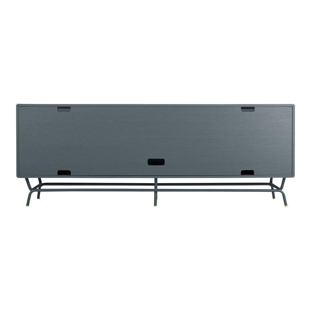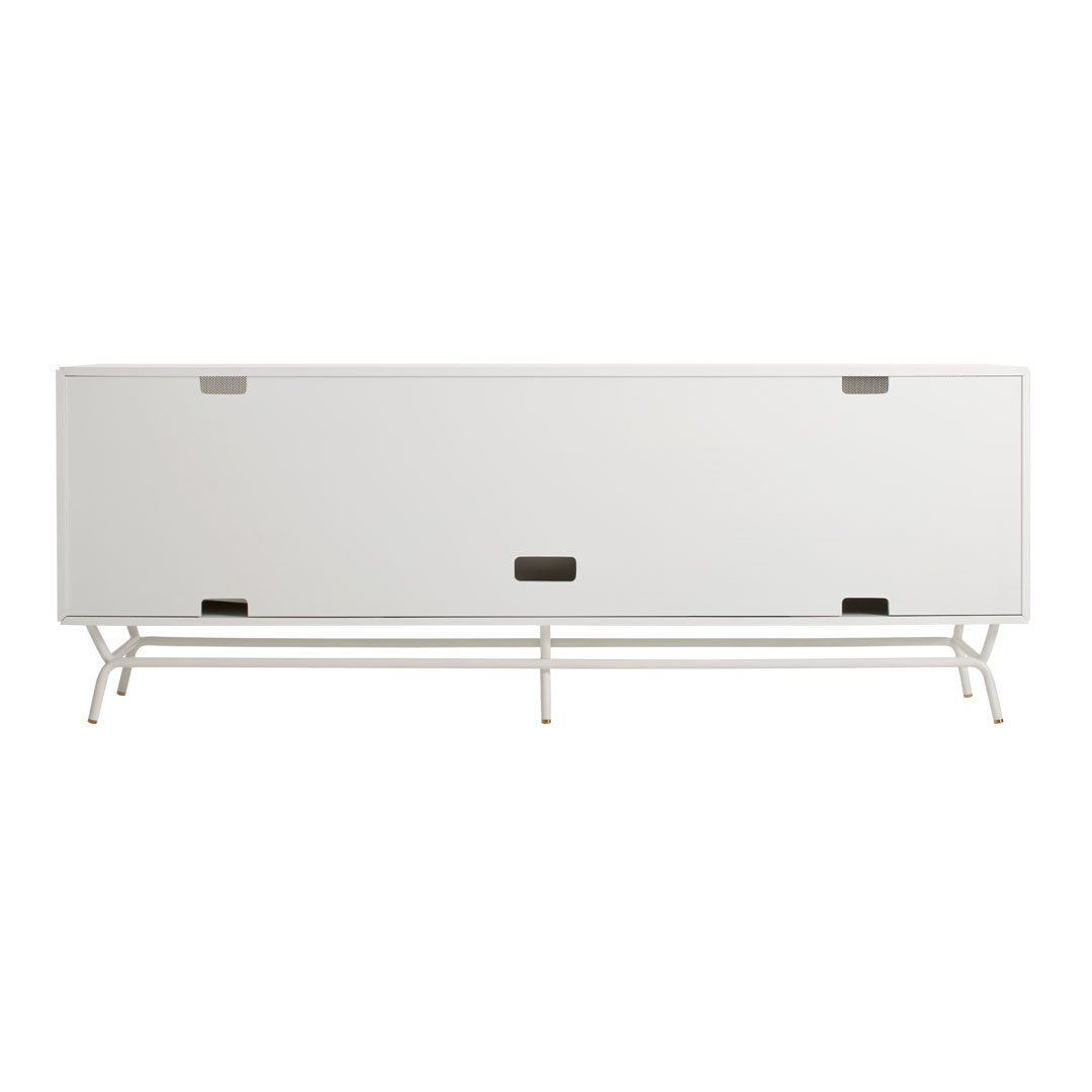 Dang! She's a bute! Perforated steel door front allows use of remotes without spoiling the view. Brass details and powder-coated steel base.