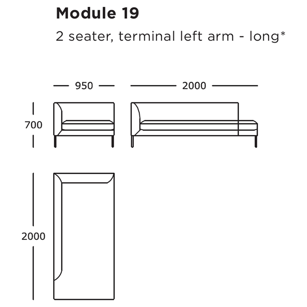 Module 19 (2 Seater, Long, Terminal Left): 37.4" W x 78.7" D x 27.6" H | 16.5" SH