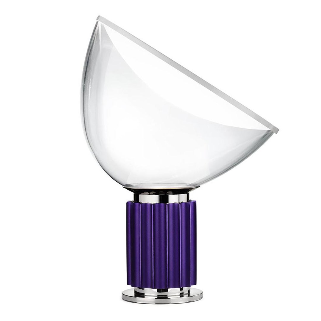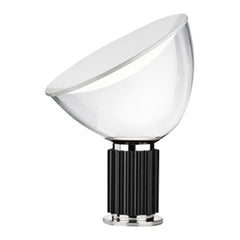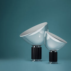 The Taccia emits reflected light. This iconic contemporary table lamp is available in black/anodized aluminum and has two options for its light source: