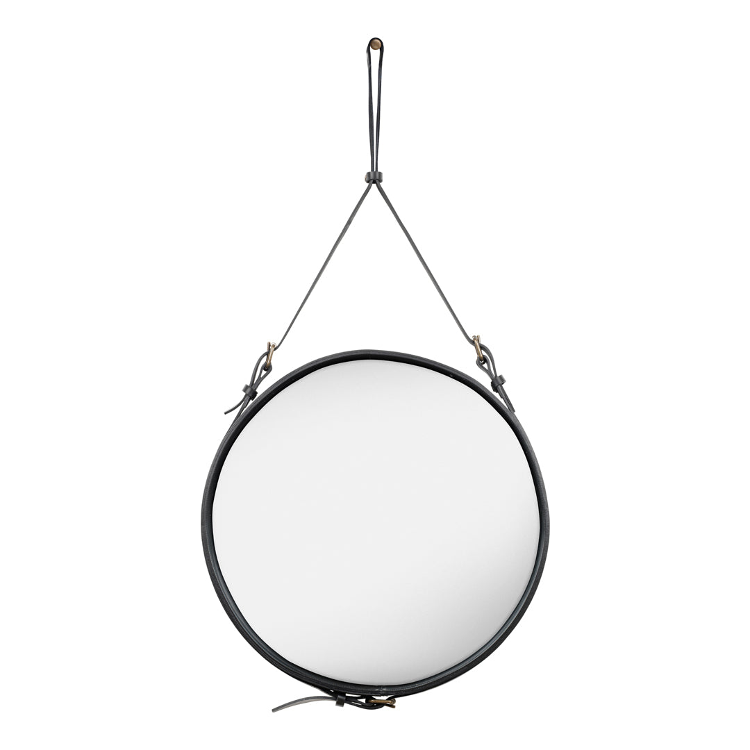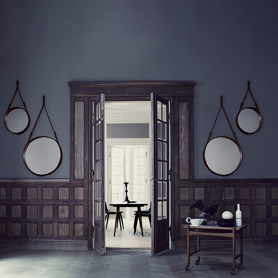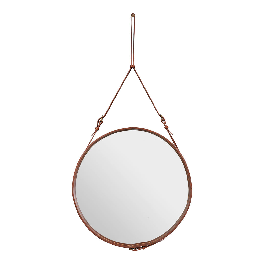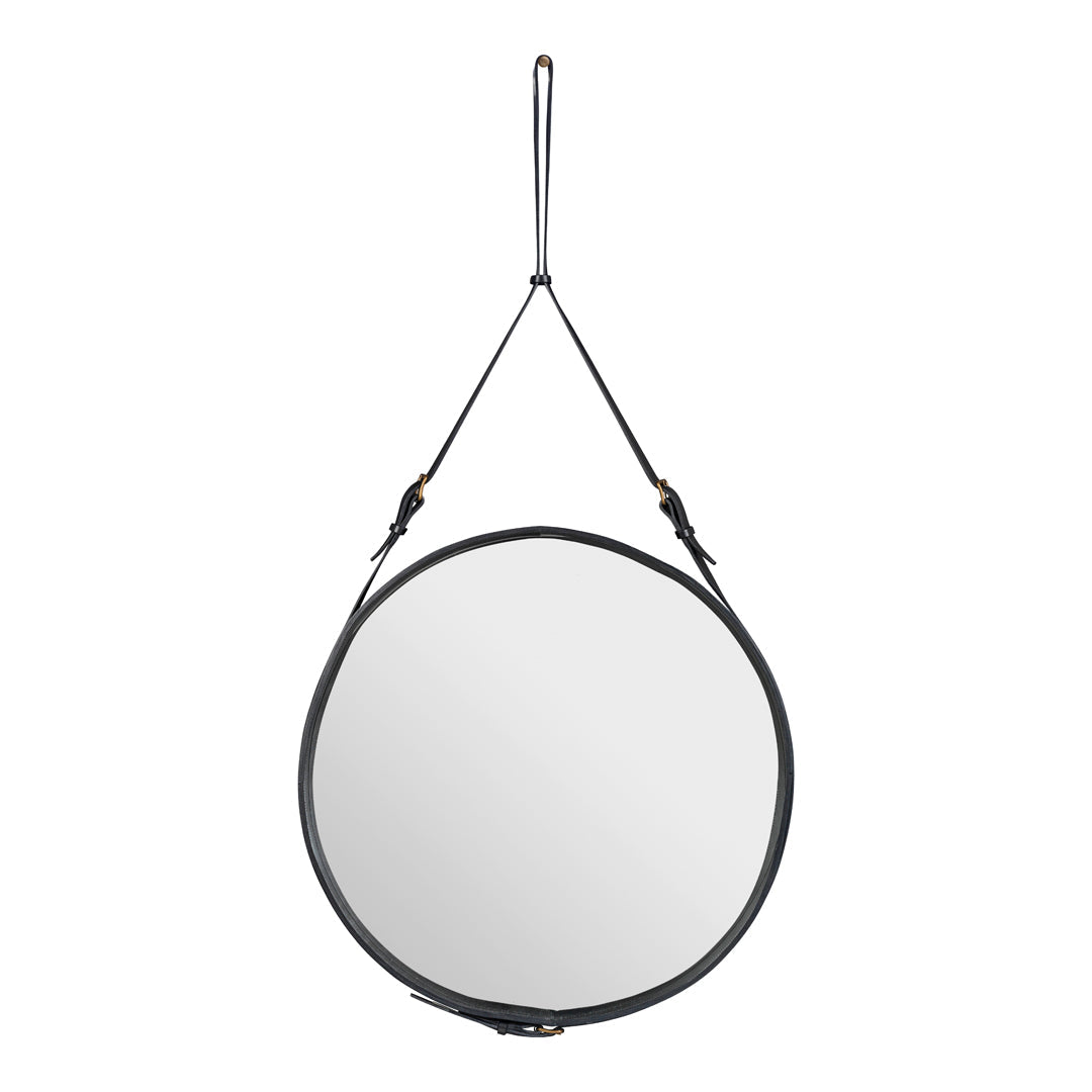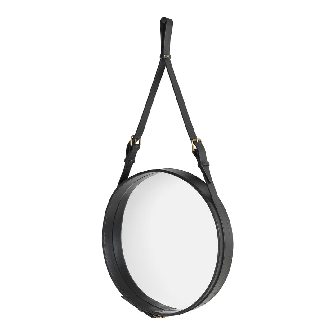 In 1950, Jacques Adnet formed a partnership with a famous French fashion house, where he developed a collection of discreet yet voluptuous leather-covered furniture and interior accessories. Known for being an innovative thinker, Adnet was one of the first designers to combine leather with glass. Accordingly, he designed the elegant, distinctive round leather mirror with equestrian inspired detailing - the Adnet Circulaire Mirror. Besides the remarkable leather and burnished brass details, the mirror in three sizes is also unique as the strap holding the mirror is in direct proportion to the dimension of it.