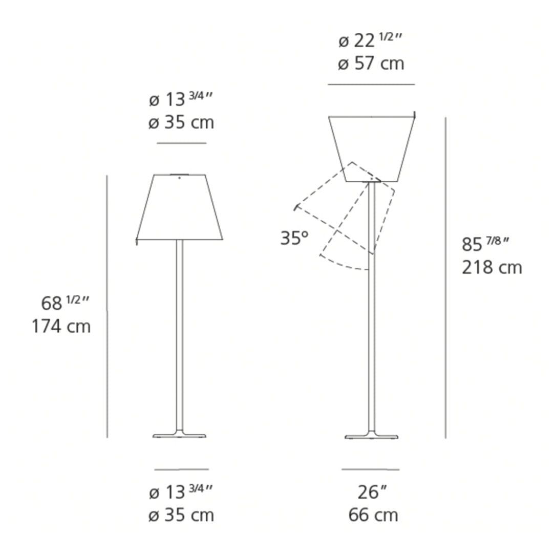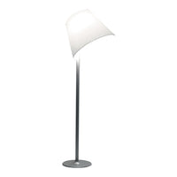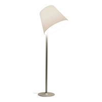 A silk satin fabric shade connected to a painted zamac base via a painted aluminum stem. Melampo can be adjusted for direct and indirect light.
