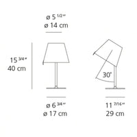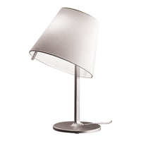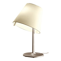 A silk satin fabric shade connected to a painted zamac base via a painted aluminum stem, Melampo can be adjusted for direct and indirect light.