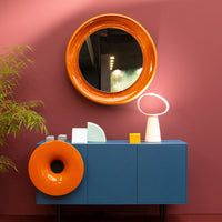 Coque has a taste for dynamic, rich contrasts. The mirror is protected by a ceramic shell, which embraces two opposing finishes: glossy and matt. The inner surface is enamelled and shiny, while the outer skin is textured. The mirror is transformed into a precious object that accentuates the natural materials, with reflections that reverberate and add depth to the living space.