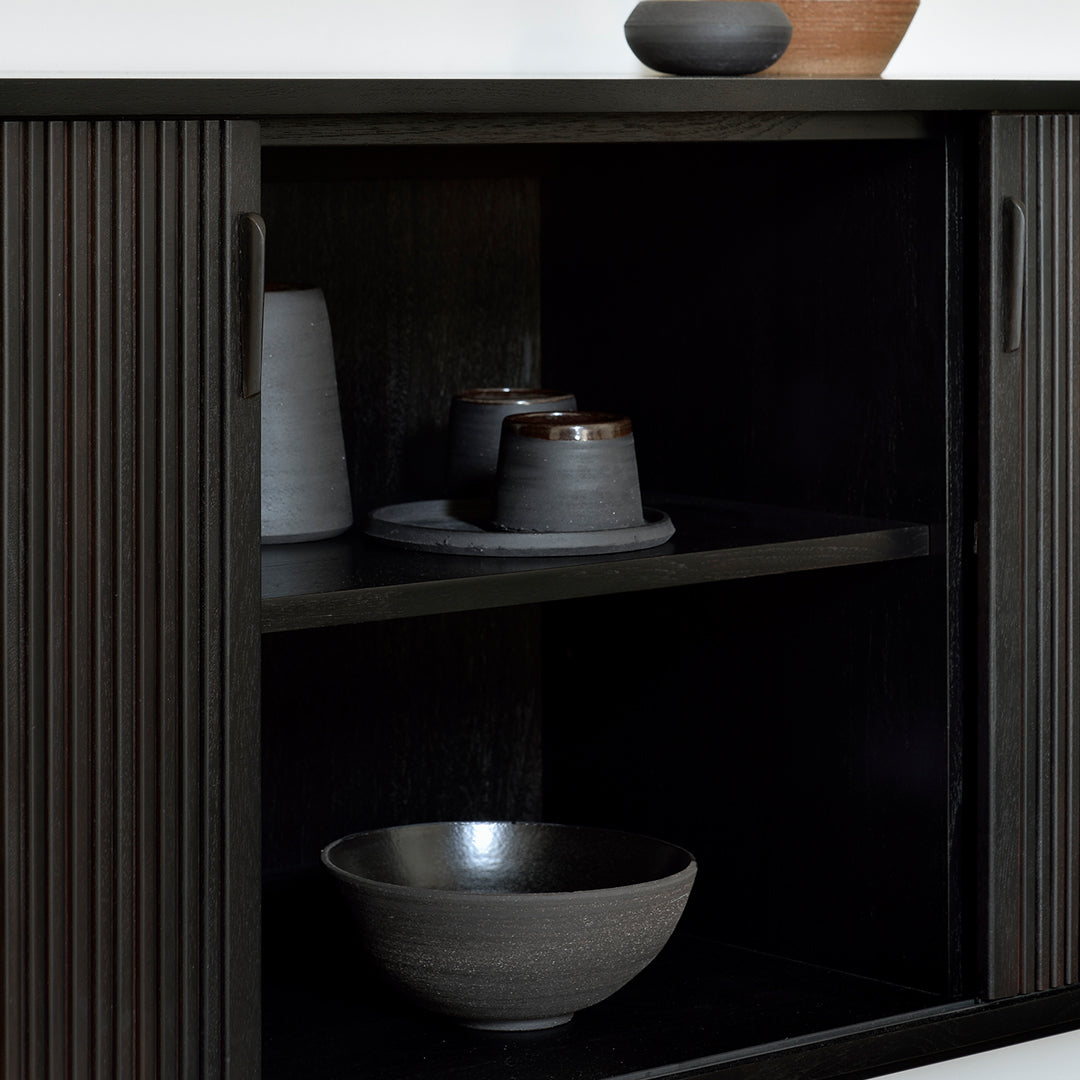 The Roller Max sideboard offers functional storage in an eye-catching design. Featuring sliding doors, adjustable shelving and seamlessly integrated handles, this piece beautifully showcases the collection's stacked wood-stick design. The result is an elegant and sophisticated item for both residential and commercial spaces. Designed by Alain van Havre.