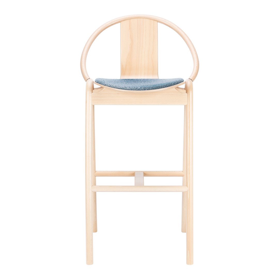 Generous proportions handcrafted from bent wood. Available in two heights, the wooden barstool takes a form typically seen in metal furniture and applies it to solid wood. Thanks to specialised manufacturing processes, the barstool is solidly built despite its delicate appearance, and will prove its worth in places with a high demand for quality and durability. Just like the chair in this collection, the barstool is available in several upholstery variations.