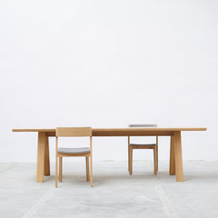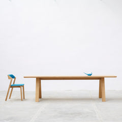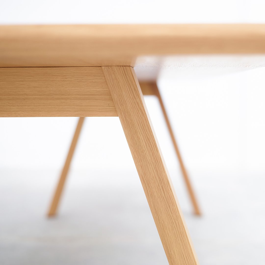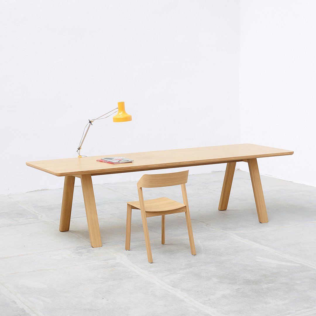 A large table with solid legs, rounded edges and timeless design. As there is no apron, you can easily fit not only chairs, but also armchairs with armrests under the veneer desk.