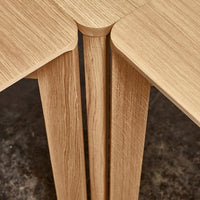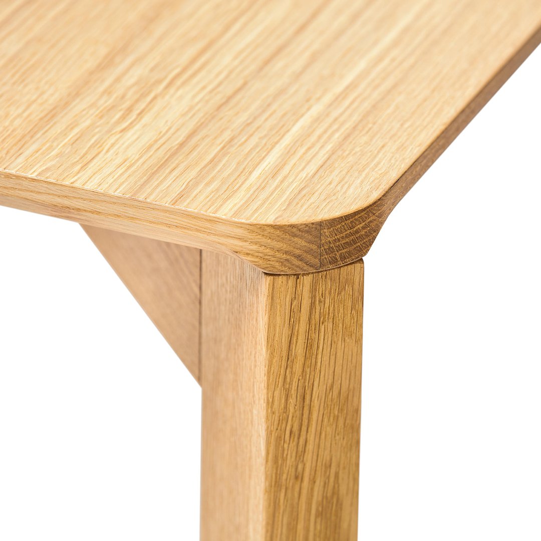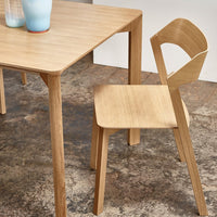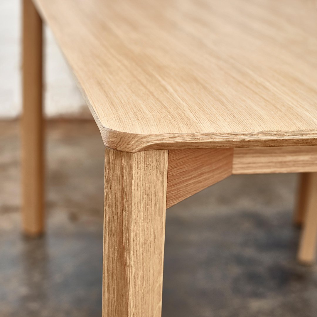 A table with simple forms perfect for various interiors, thanks to the variability of the final finishing. The canted legs—whose shape references the Merano collection—support a narrow veneered tabletop with solid wood lipping. These tables can be joined together and combined into larger units—for instance in dining halls, conference rooms, or offices.