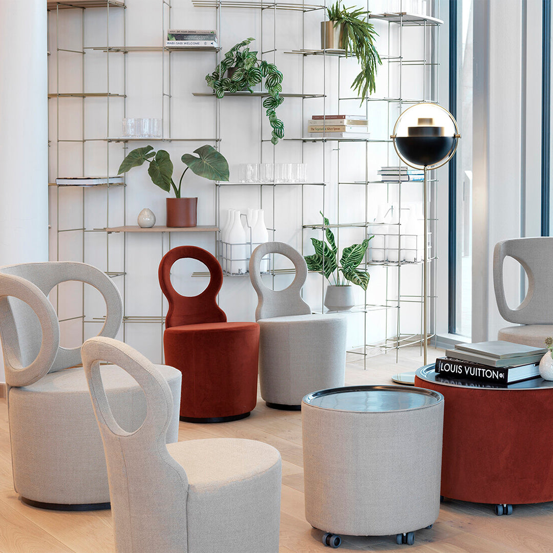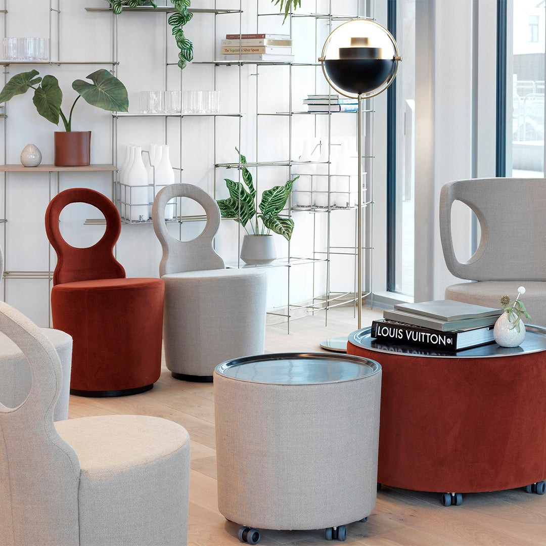A combination of a chair and a pouf suitable for a wide range of uses. Ability to combine a wealth of different colors and patterns to set your own unique stamp on a space. Perfect for break areas in offices, lounges, coffee rooms and cafés.