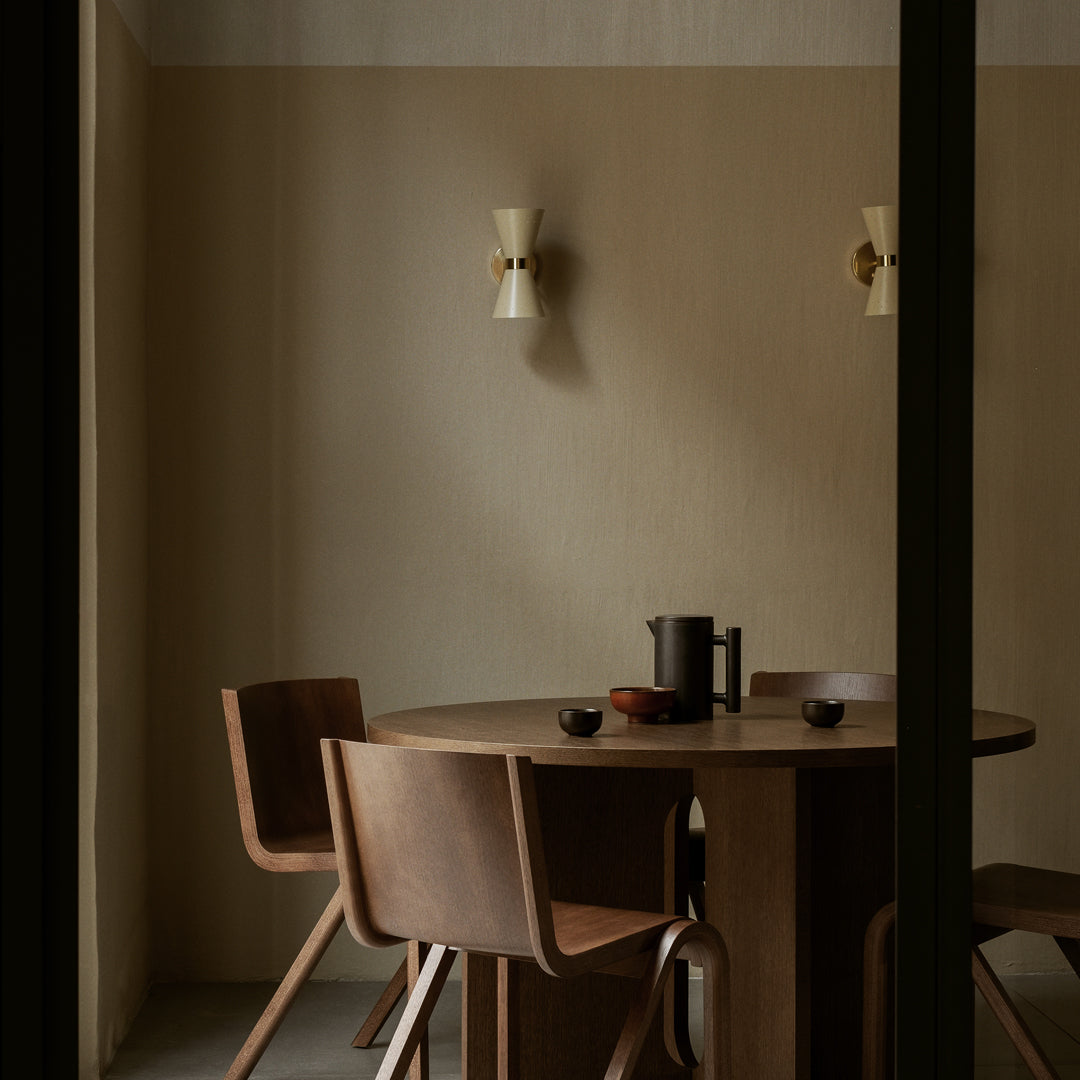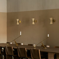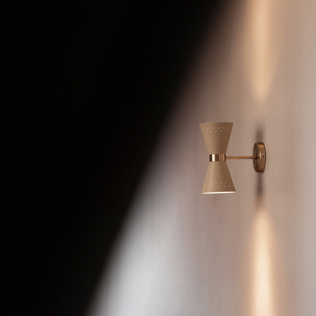Swedish designer Alf Svensson devised the Collector series of lighting in the 1950s. One of three designs, the wall-mounted lamp is defined by its solid brass band that holds a conical metal shade which projects the light in two directions. Small perforations in the shade allows the light to shine through. The name references the collectability of the series, profiling mid-century lighting design at its very best.
