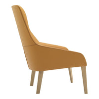 High back lounge chair with upholstered seat and backrest and a 4-legged beech wood base.