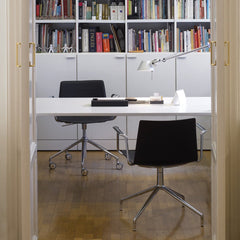Armchair with four star aluminum swivel central base and self-return system in polished aluminum finish but also available in other aluminum colors. Thermo-polymer seat and backrest available in several colors. Optional fully upholstered shell or parallel upholstery stitching. Optional upholstered arms.