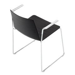 Stackable armchair with a steel sled base in polished chrome finish. Thermo-polymer seat and backrest available in several colors. Optional fully upholstered shell or parallel upholstery stitching. Also available: Upholstered arms option. The upholstered version includes a stacking protector.
