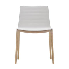 Chair with a 4-legged solid beech wood base. Thermo-polymer seat and backrest available in several colors. Optional fully upholstered shell or parallel upholstery stitching.