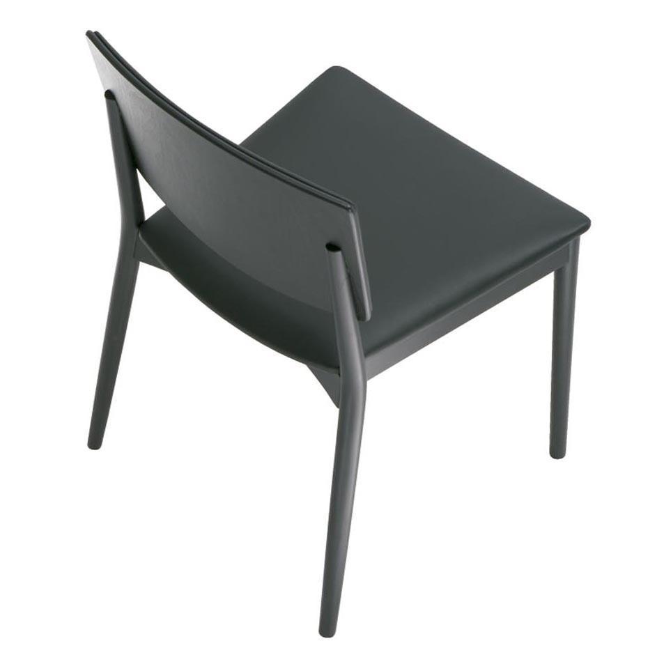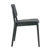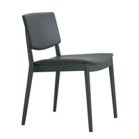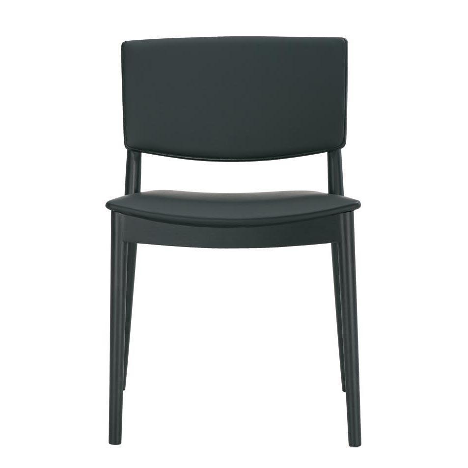 Stackable chair with upholstered seat and backrest and solid beech wood frame.