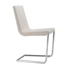 Chair with upholstered seat and backrest and steel oval plate cantilever base in polished chrome finish.