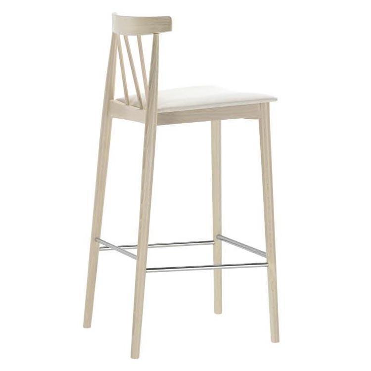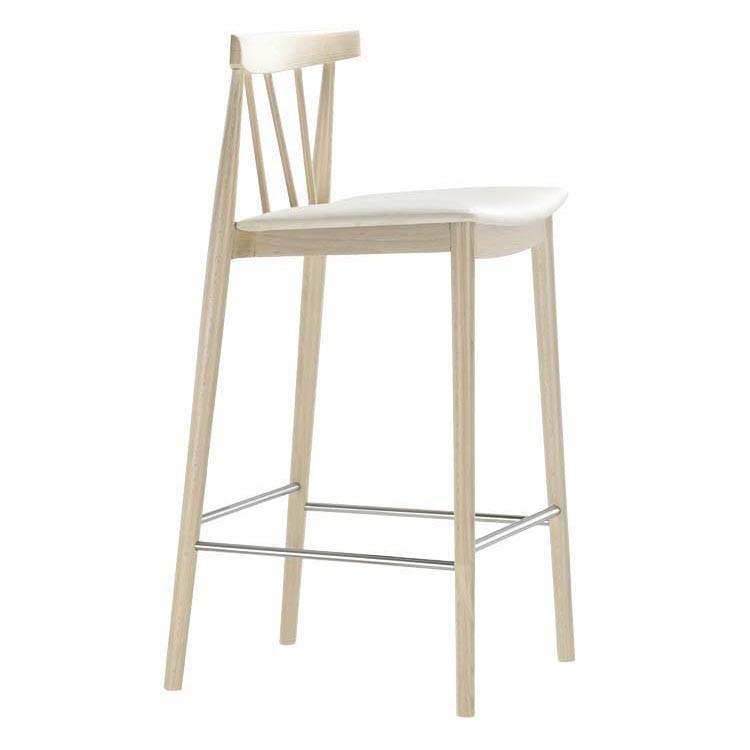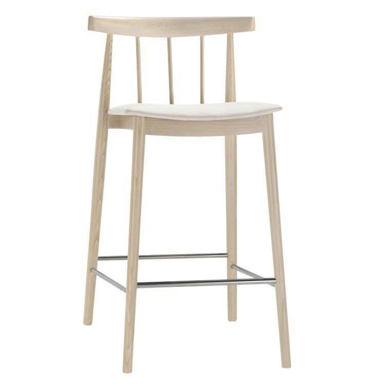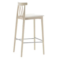 Barstool with upholstered seat, solid beech wood spindle backrest and frame. The wood lacquer color options (White, Red, Black, Sand, Basalt Grey, Cayenne Red, Dark Grey, Yellow Mustard) are available in both matte and glossy finishes.