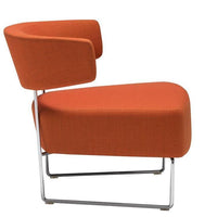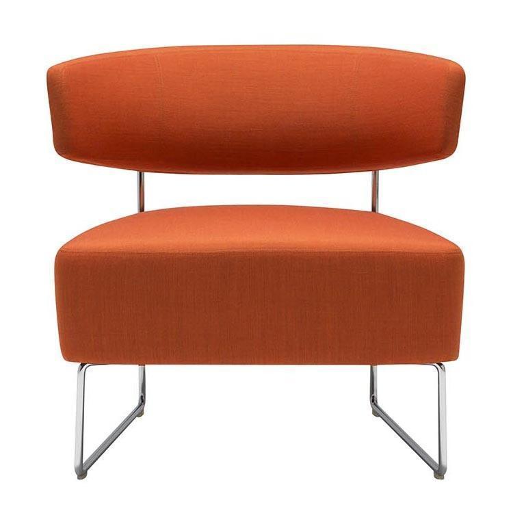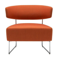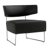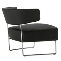 Lounge chair with upholstered seat and backrest and steel sled base in polished chrome finish.