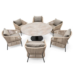 The Cricket Lounge Armchair is identified by the hand woven rope backrest. Its twisting is a precious craftsmanship element, a refined detail that emphasizes shape and design.