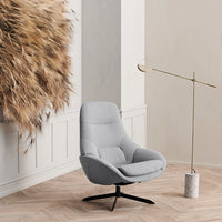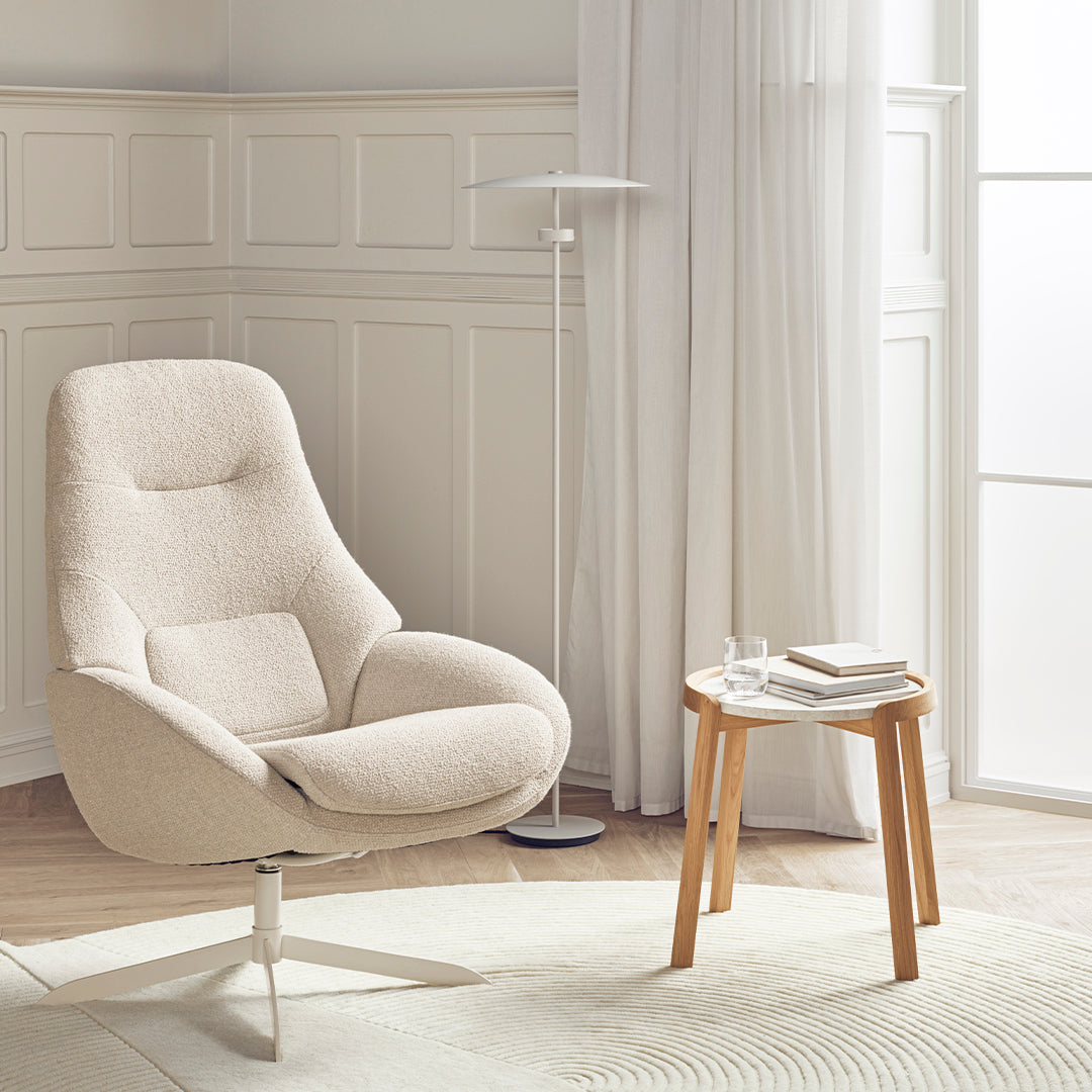 The Saga armchair is a classic swivel armchair, designed for relaxing breaks and comfortable napping. The curvy shapes provide great ergonomics, perfectly moulded in soft foam to support your body. Tailormade just for you in your fabric or leather of choice.
