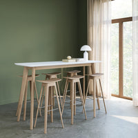 The stool comes in several models and styles. The beautiful wooden base is available in white pigmented matte lacquered oak or black lacquered oak, and comes in two heights. Choose between an upholstered version with a black PU leather seat or a veneer seat. The chair also has the practical feature of being possible to hang up on a high table.