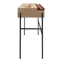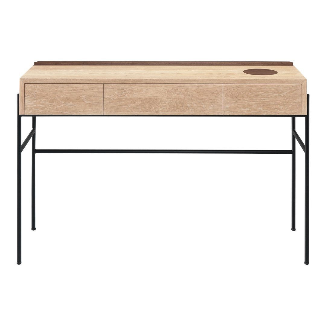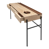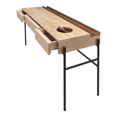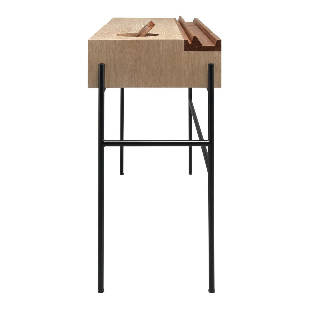 Its top features a practical storage with several compartments such as three drawers, one round lid compartment to collect the items on the top and one shaped strip in solid walnut with supporting grooves to display books and magazines.