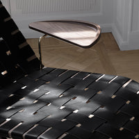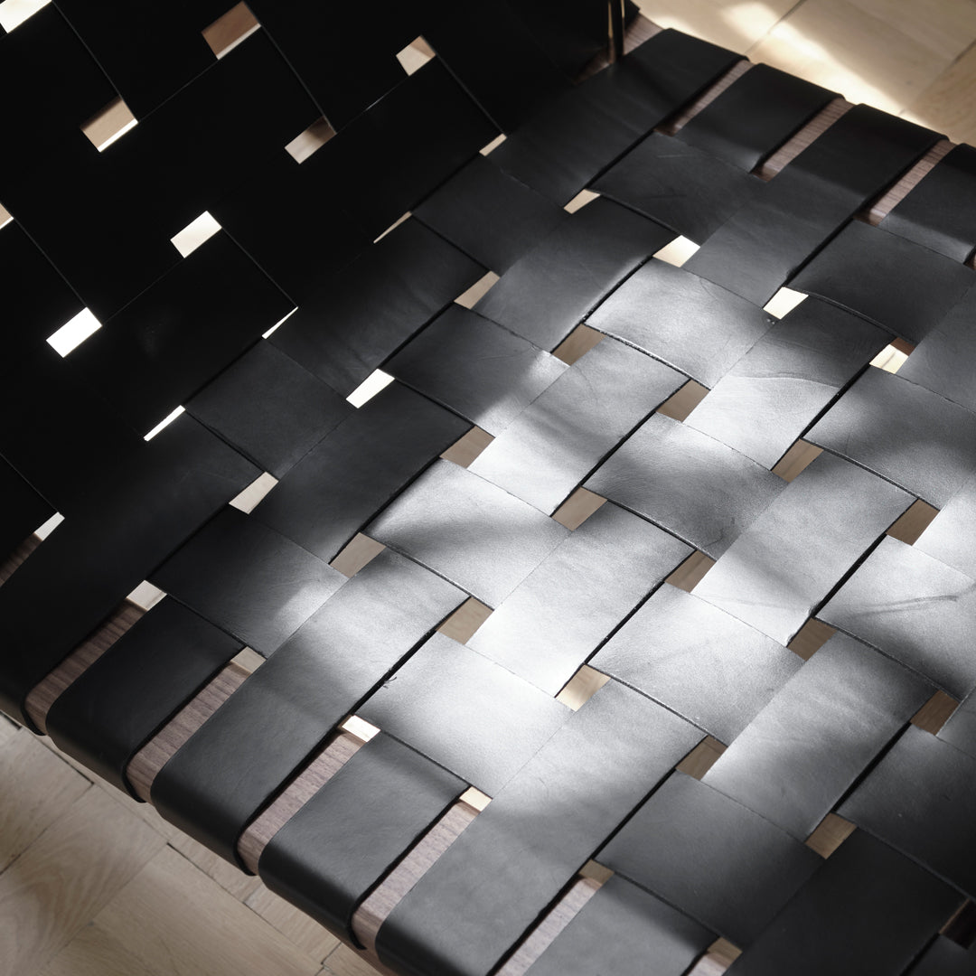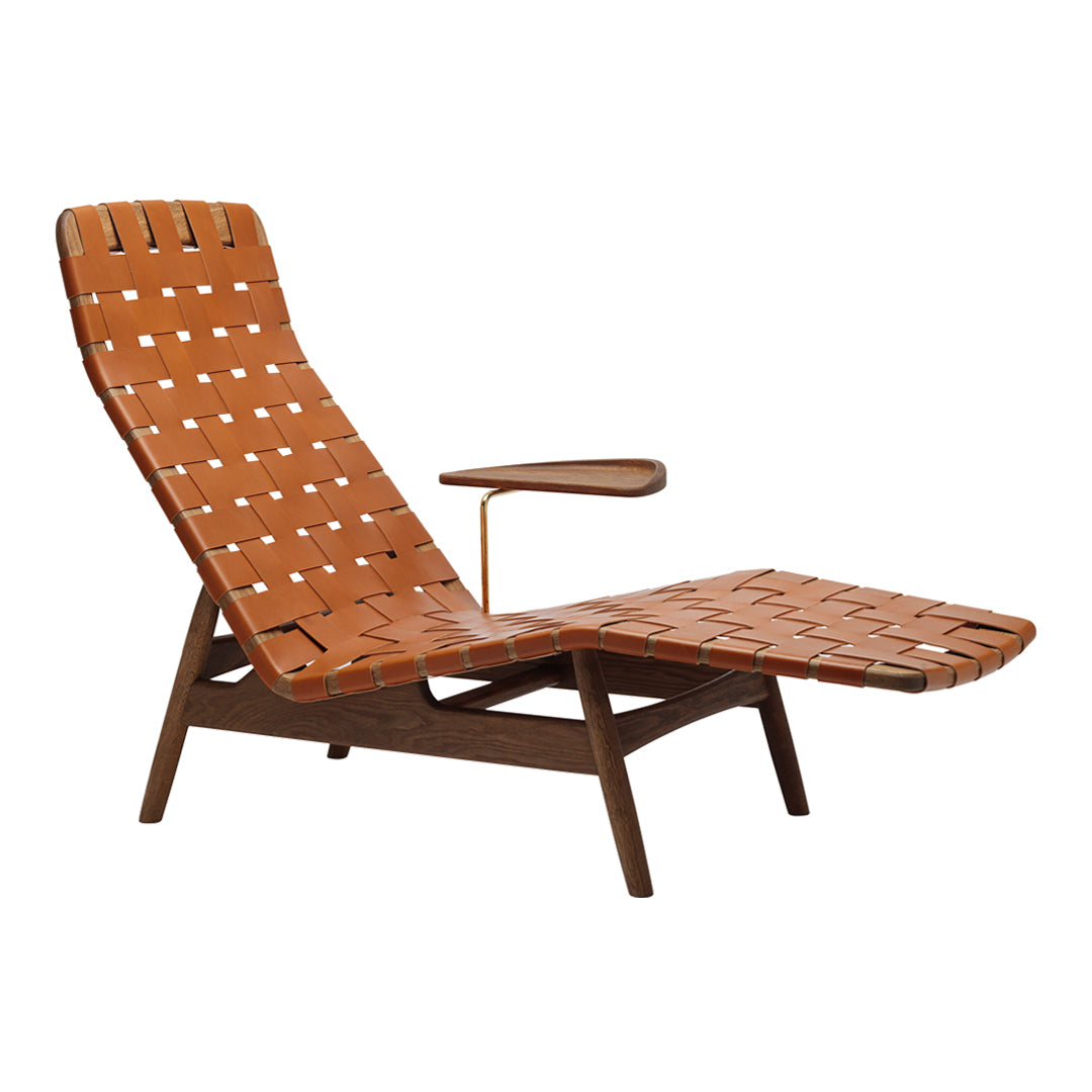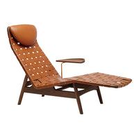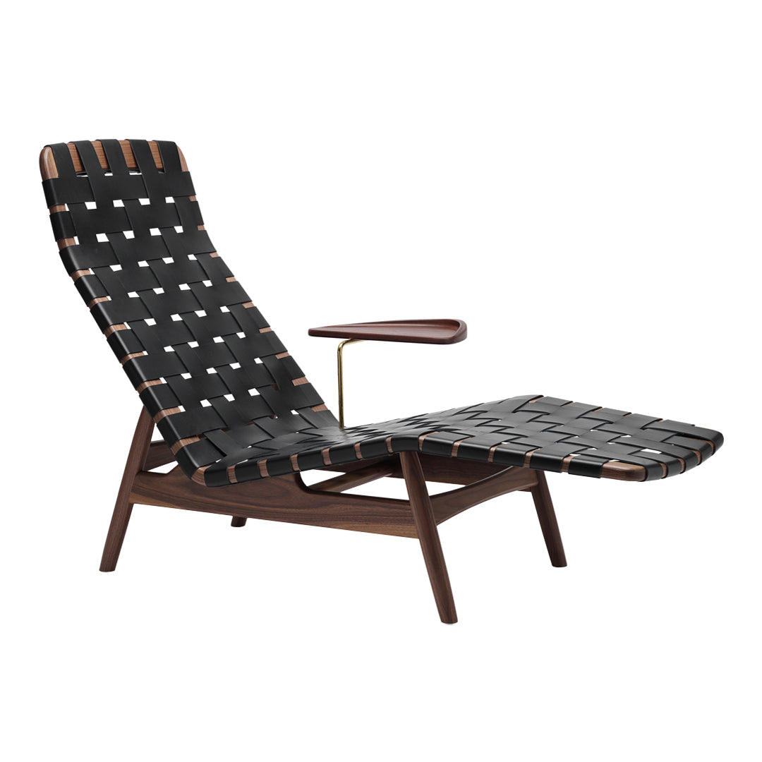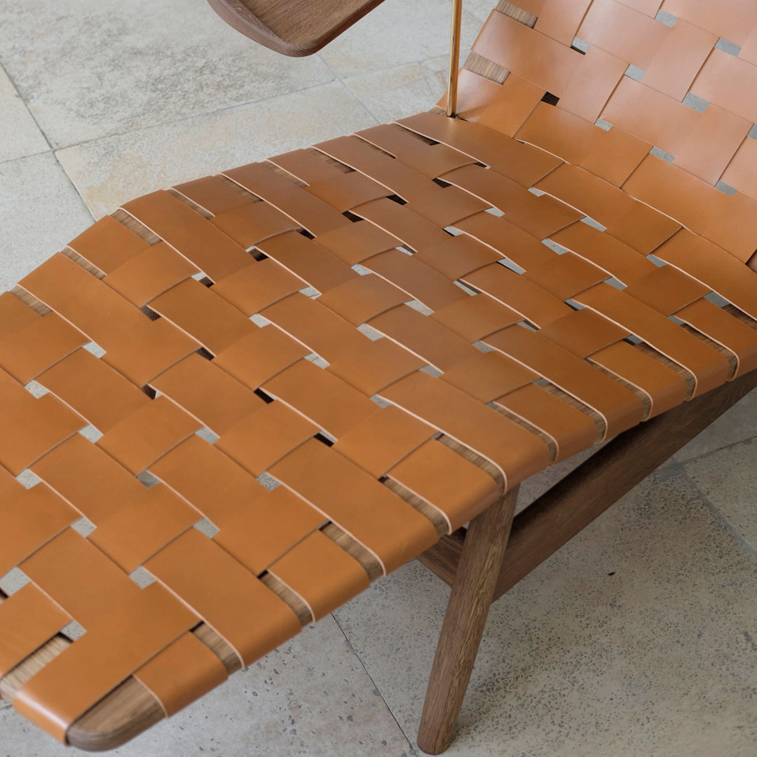 The AV Egoist chaise lounge is available in walnut or FSC-certified oak in finishes soap, white oil, natural oil, dark oil and smoked. Woven shoulder leather in black, brandy and nature. The chaise lounge is available with a cushion for the back of the head, as well as a side table of brass and solid oak or walnut.