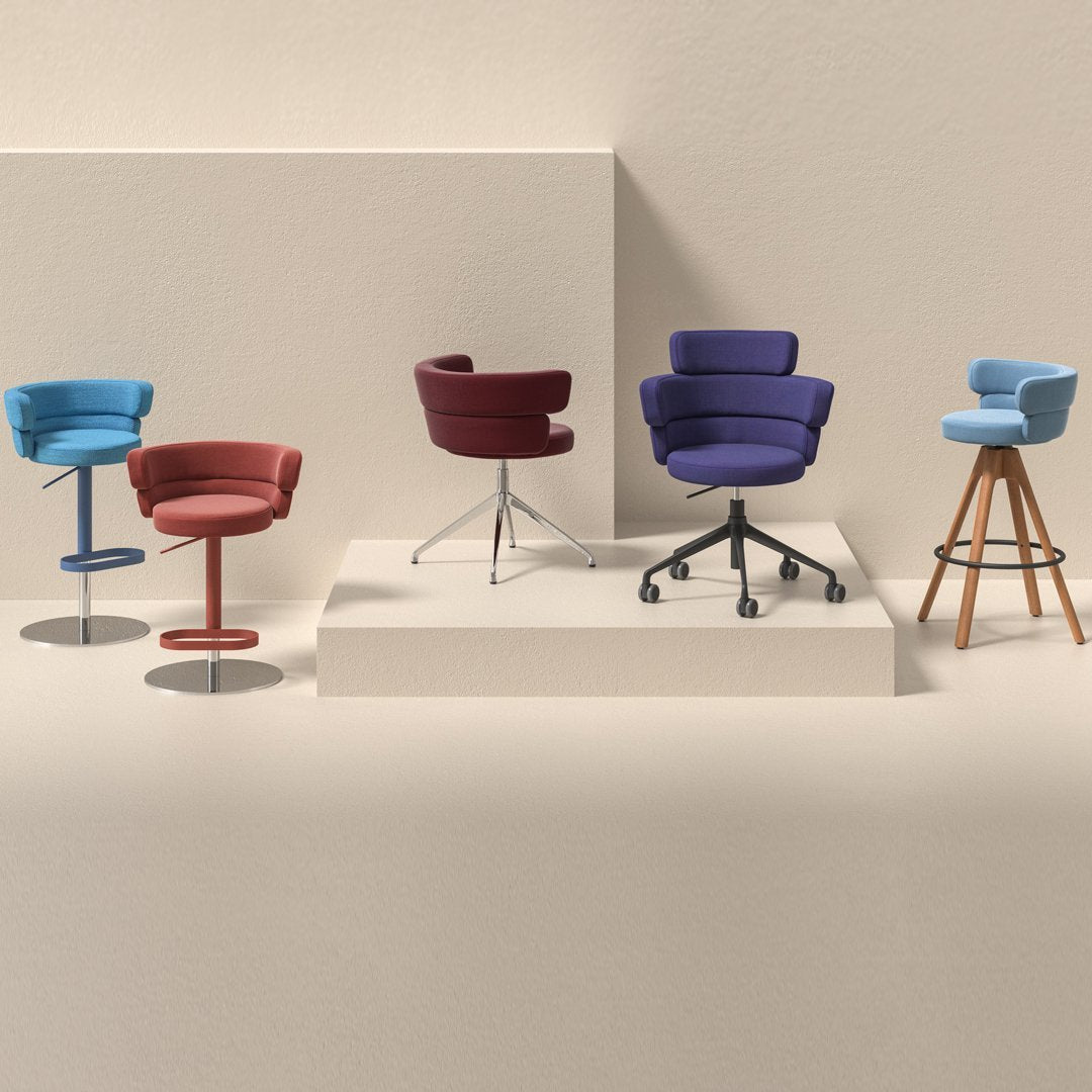 Dam is a collection of upholstered seats consisting of swivel armchairs and stools. The seat, round and well padded, is wrapped in the backrest with two or three overlapping bands that in addition to offering a comfortable lumbar support serve as armrests. The armchair is available with a perch base, with or without pirouette wheels, while the swivel stool is supplied with an adjustable base in satin stainless steel height and chrome or painted footrests, or with a wooden base.