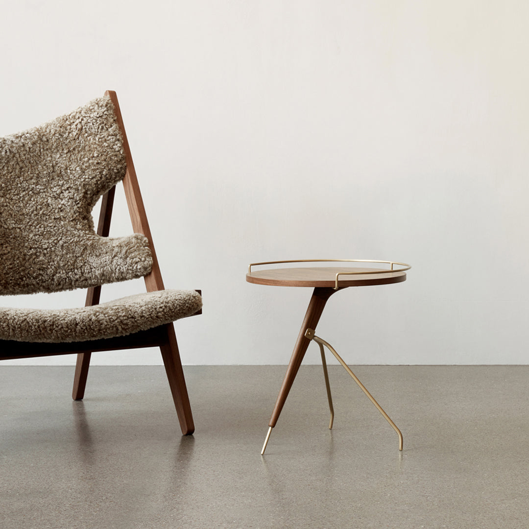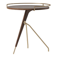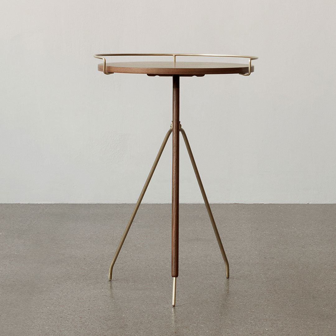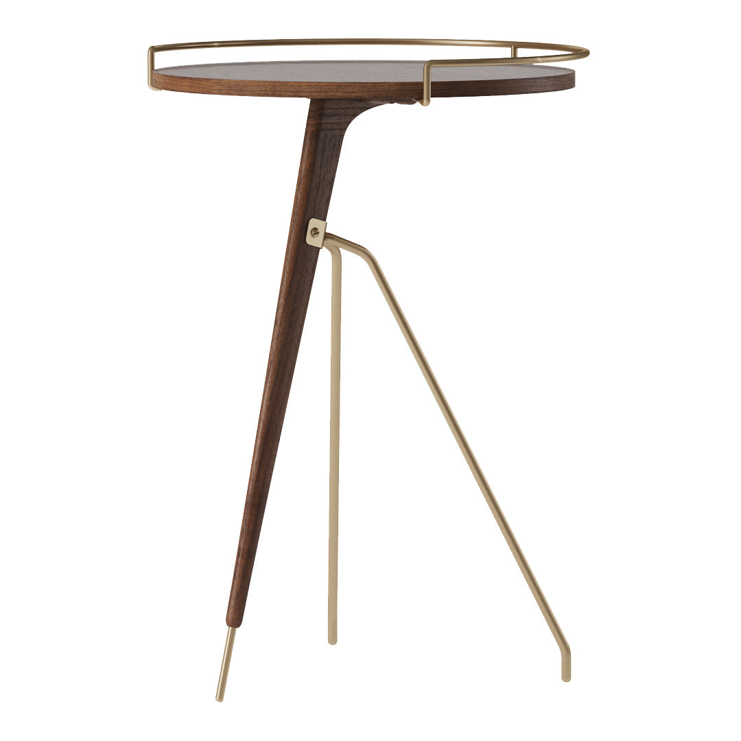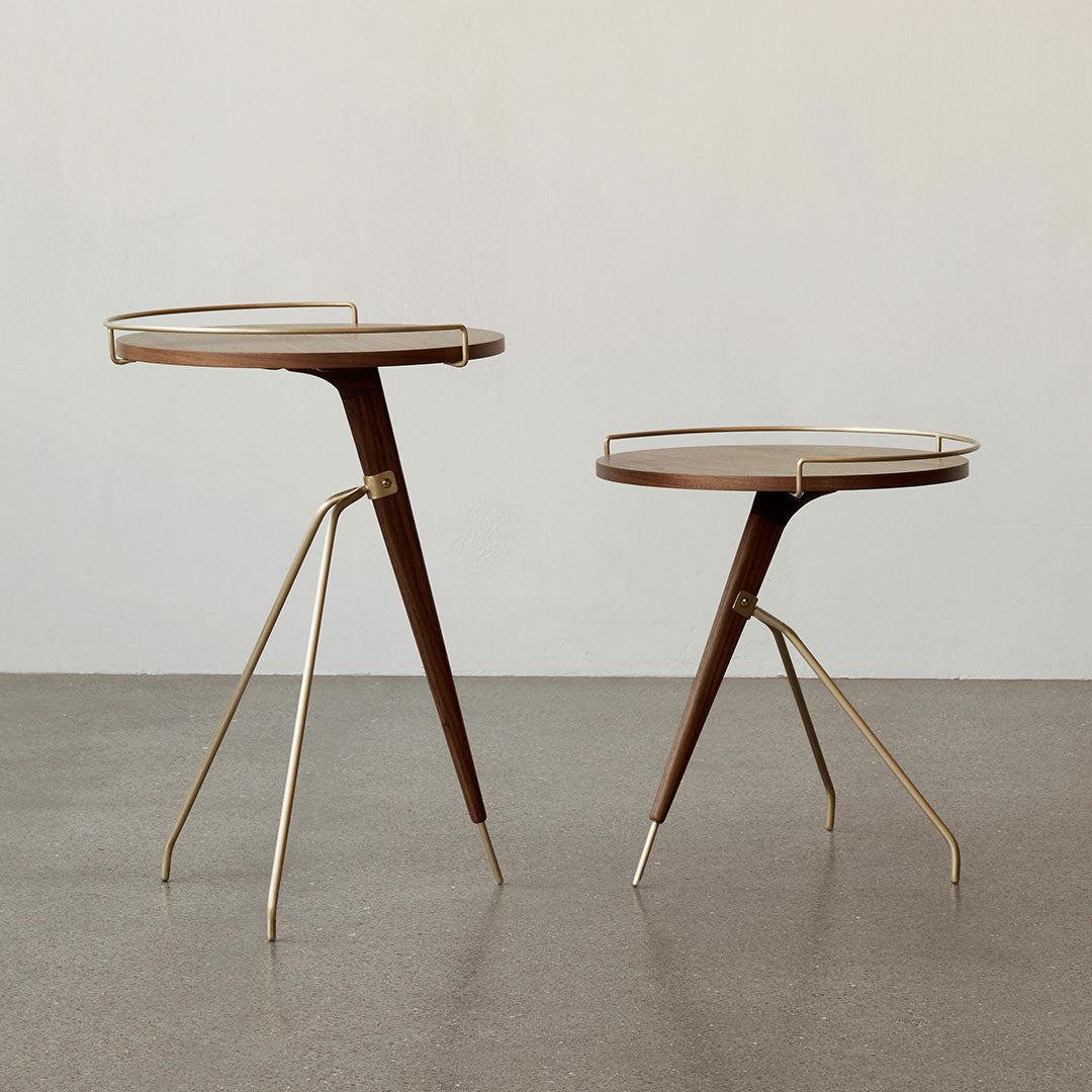 The Umanoff Side Table from Audo Copenhagen (formerly Menu) exemplifies timeless mid-century modern design that feels as fresh and relevant today as when Arthur Umanoff first conceived it in the 1950s. This reissued classic beautifully balances rich walnut wood with sophisticated brushed brass detailing, creating a striking visual harmony between materials that celebrates Umanoff's distinctive design language. The thoughtfully rounded top and tripod-inspired frame challenge conventional furniture silhouettes while maintaining perfect structural stability—a hallmark of Umanoff's innovative approach to furniture design during America's mid-century modern movement.