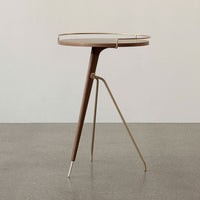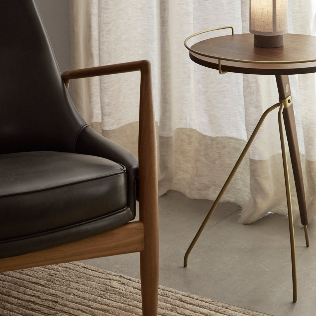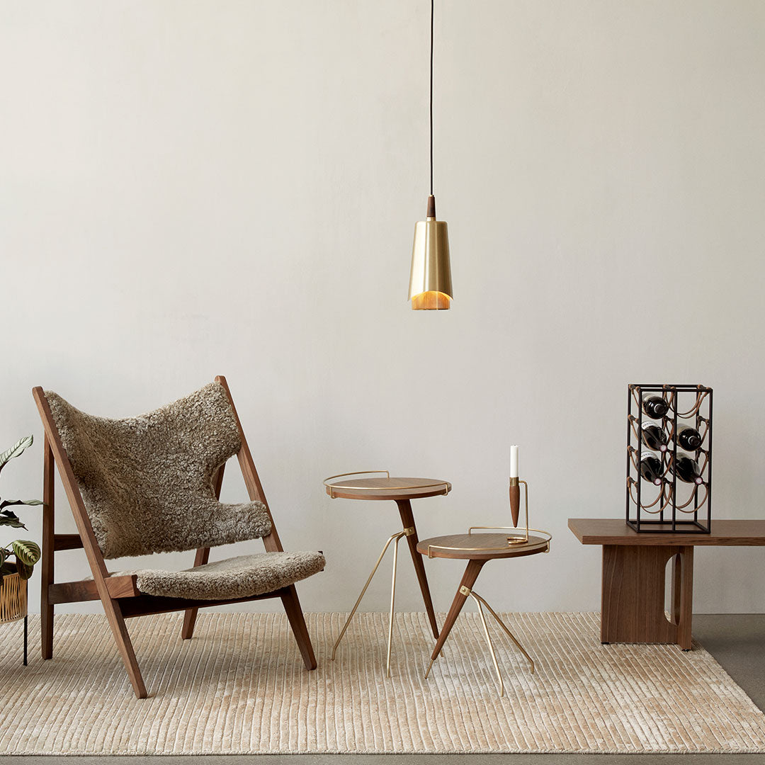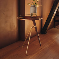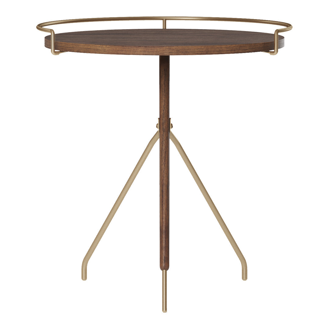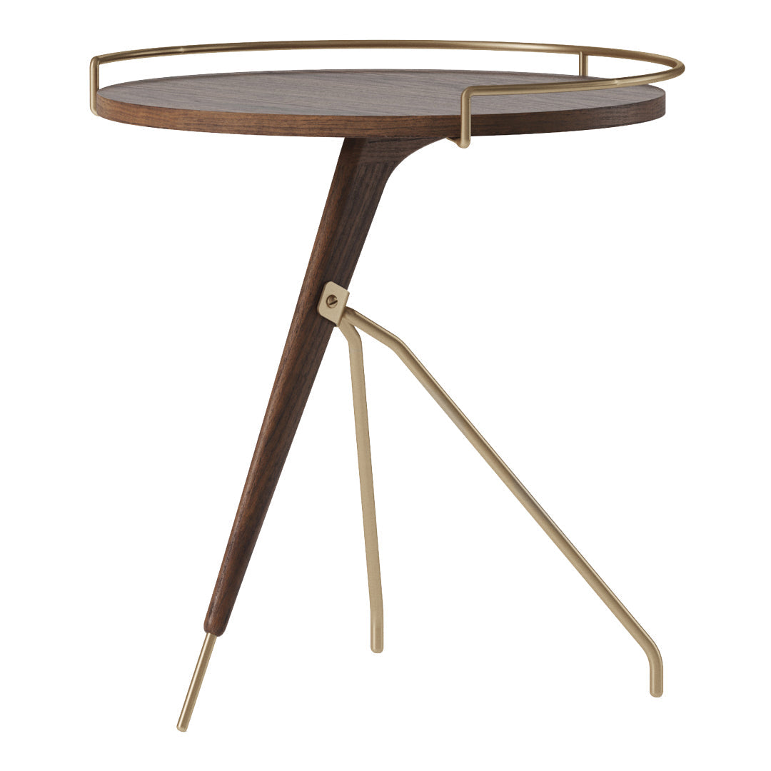 The Umanoff Side Table from Audo Copenhagen (formerly Menu) exemplifies timeless mid-century modern design that feels as fresh and relevant today as when Arthur Umanoff first conceived it in the 1950s. This reissued classic beautifully balances rich walnut wood with sophisticated brushed brass detailing, creating a striking visual harmony between materials that celebrates Umanoff's distinctive design language. The thoughtfully rounded top and tripod-inspired frame challenge conventional furniture silhouettes while maintaining perfect structural stability—a hallmark of Umanoff's innovative approach to furniture design during America's mid-century modern movement.