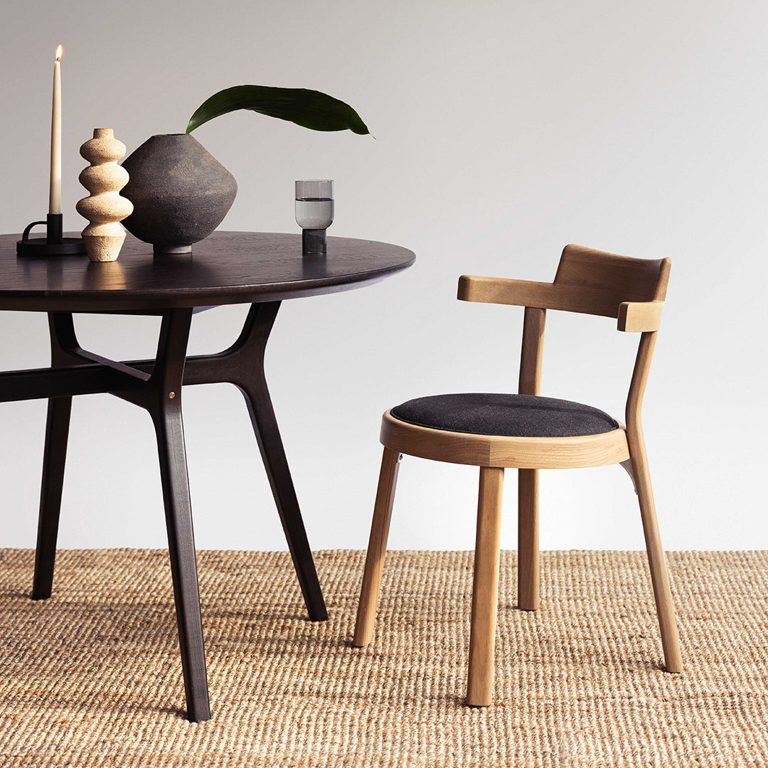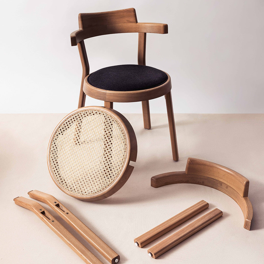 Pagoda is a collection of chairs inspired by the classic café chairs of 19th century Vienna. The chair is supremely light and compact with a structure that has been reduced to its very essence. The chair consists of only six pieces – delivering good craftsmanship and efficiency while allowing multiple material configurations. The chair’s circular seat stems from rationalization while symbolizing the “Way of Nature” or “oneness” in Chinese culture. Cantilevered arms and back subtly reference Pagoda gates, giving the chair its personality while also eliminating the need for an arm and armless version.