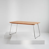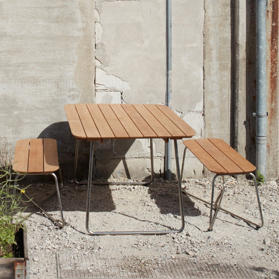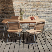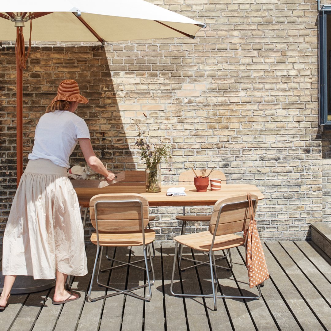 Lilium is easy on the eye and a pleasure to use. The light but strong frame in stainless steel seems to prolong the oblong tabletop all the way to the ground. The tabletop is made of teak planks placed lengthwise to make the table look even longer. Fits 4-6 people.