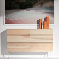 Solid wood drawer fronts. Powder-coated steel outer case with plywood interior. Powder-coated steel legs with nylon foot glides.