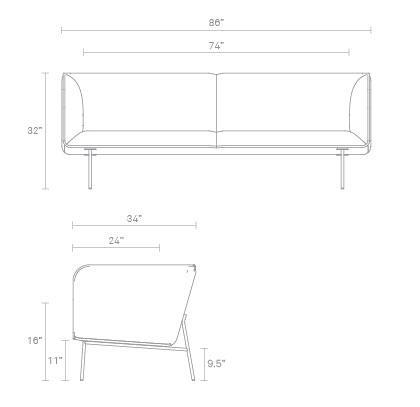 32H x 86W x 34D. Seat height: 16.