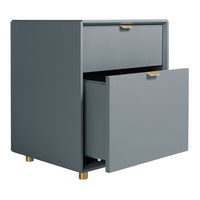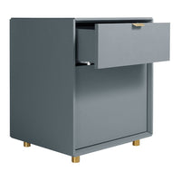 Risk averse grey, marine blue and white on oak: painted oak veneer case. Walnut: Walnut veneer over engineered wood case. Solid engineered substrate. Brass handle and leveling feet.