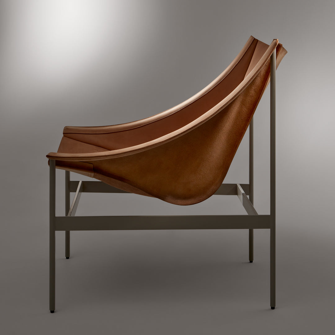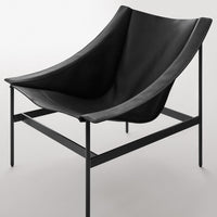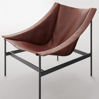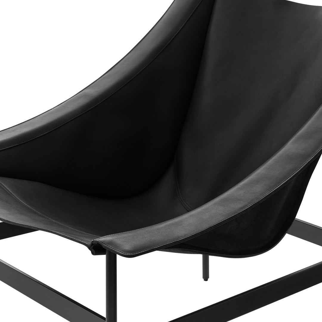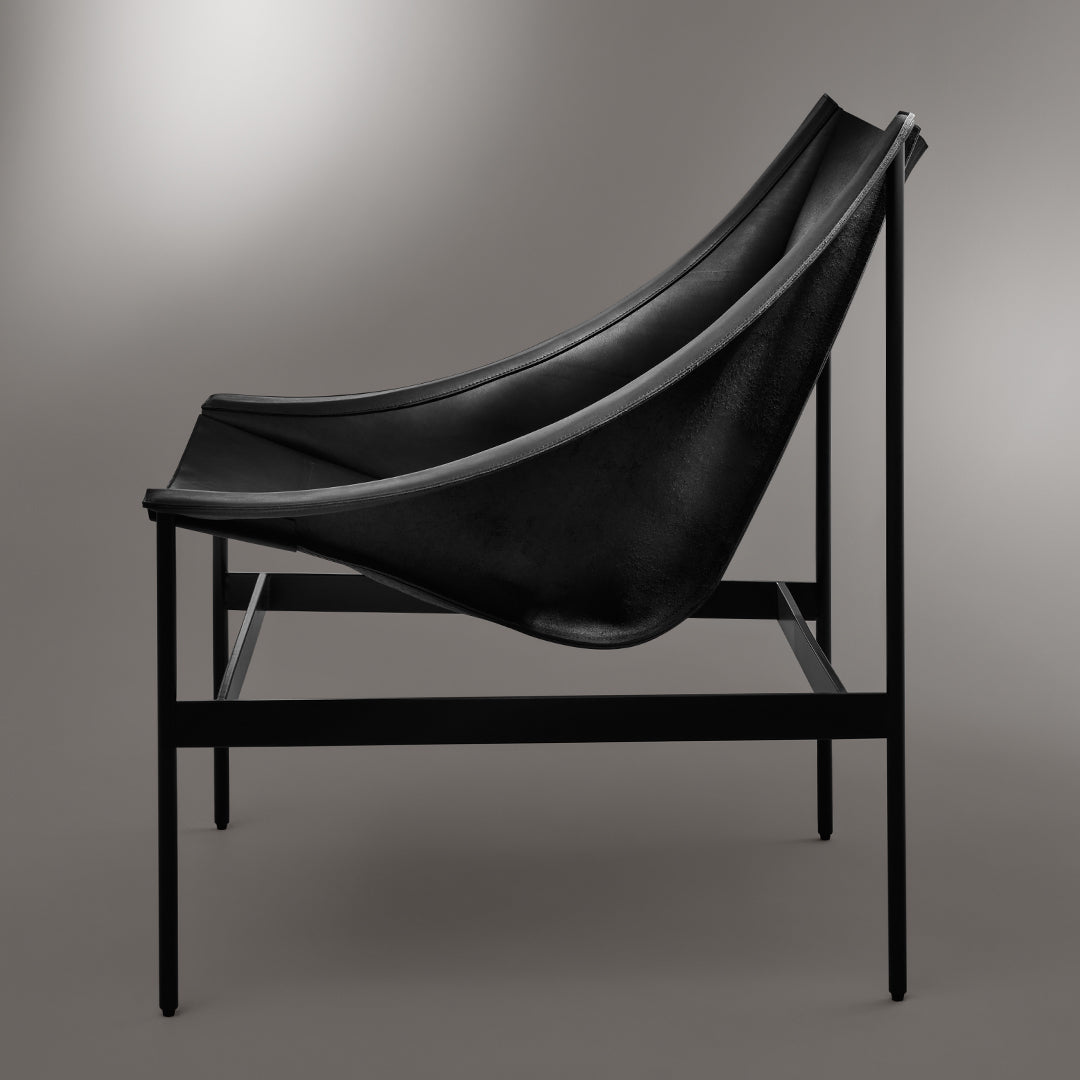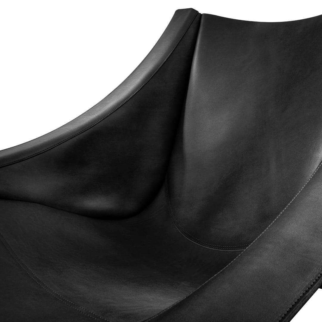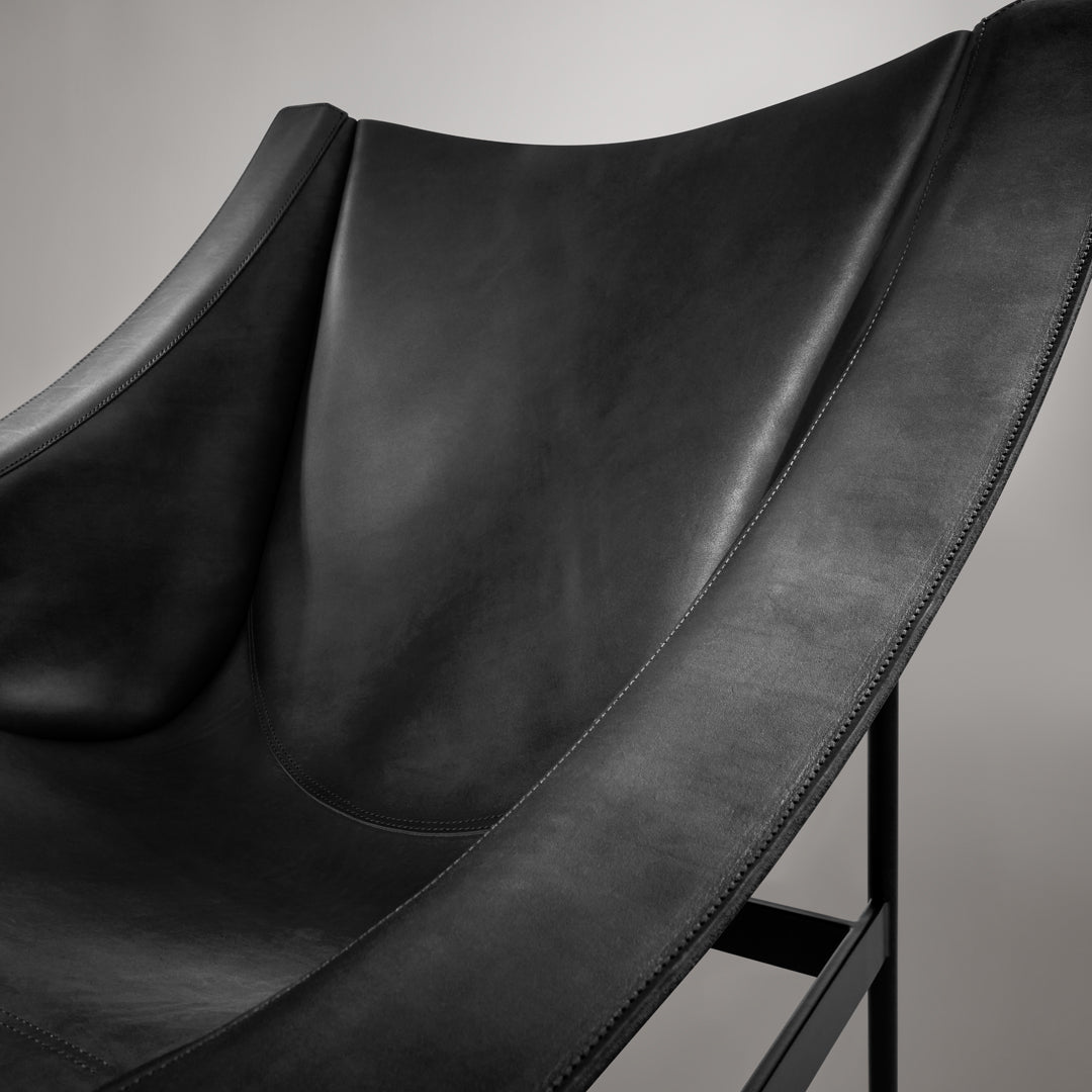 The chair's dramatic silhouette creates immediate visual tension between the geometric precision of its powder-coated steel rod and bar stock frame and the organic draping of its full-grain leather sling. This material contrast establishes both visual intrigue and physical comfort as the supple leather cradles the body in a naturally ergonomic position that encourages extended relaxation. The suspended design eliminates pressure points found in conventional upholstered seating, creating a floating sensation that transforms routine sitting into a distinctive experience.