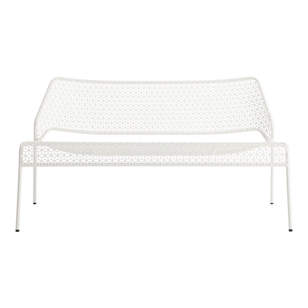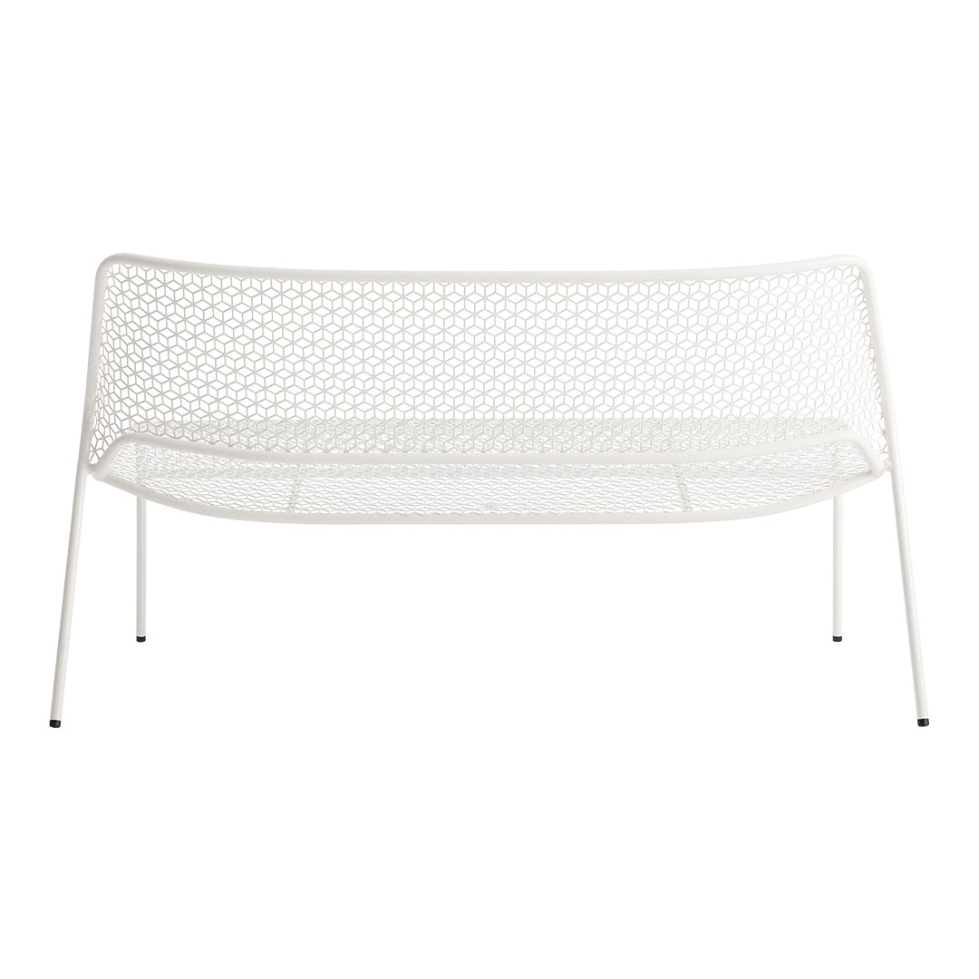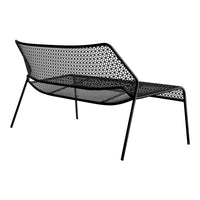 The settee's bold punched metal surface creates an immediate visual focal point through its geometric perforation pattern, which serves multiple functions beyond mere aesthetics. These calculated openings allow for air circulation on warm days, quick drying after rain, and a comfortable, breathable sitting experience in all conditions. The tubular steel frame provides both structural support and visual lightness, creating a piece that feels substantial without appearing heavy—perfect for spaces where both style and spatial efficiency matter.