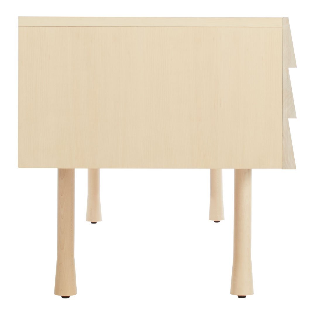 Overlapping wood drawer and door fronts give the collection its name, while the white washed maple finish and a scene stealing leg bring the visual charisma. With soft close doors and drawers.