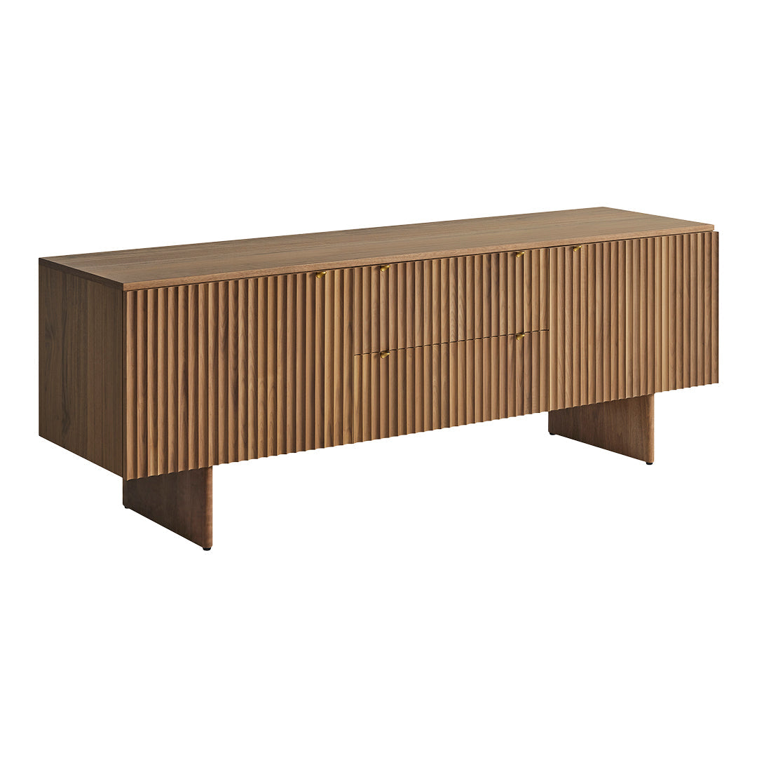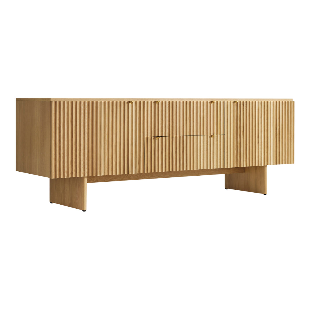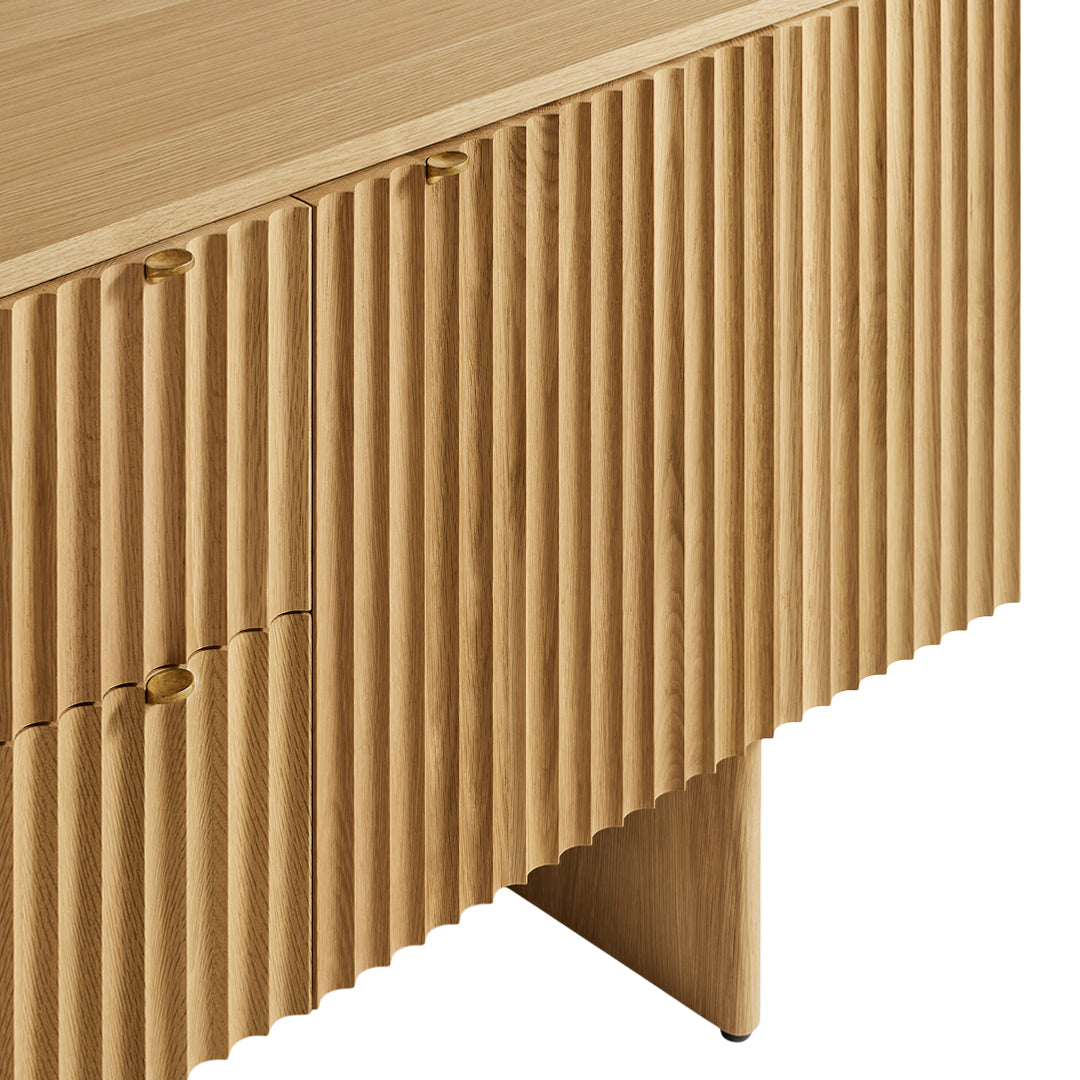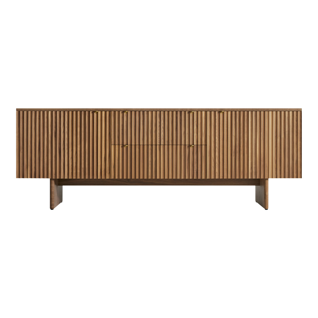 Complementing the fluted wood pattern, small sandcast brass pulls nest discreetly within the grooves, adding metallic accents that enhance the console's refined aesthetic without overwhelming its clean lines. The distinctive convex legs provide both sturdy support and visual lightness, elevating the piece both literally and figuratively within the space it occupies.