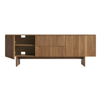 Distinguished by its linear silhouette and elongated proportions, the console features a facade of continuous fluted wood that creates a mesmerizing textural rhythm across its surface. This dimensional woodworking technique transforms a simple console into a statement piece, capturing and playing with light throughout the day while inviting tactile engagement with its subtle ridges and valleys.