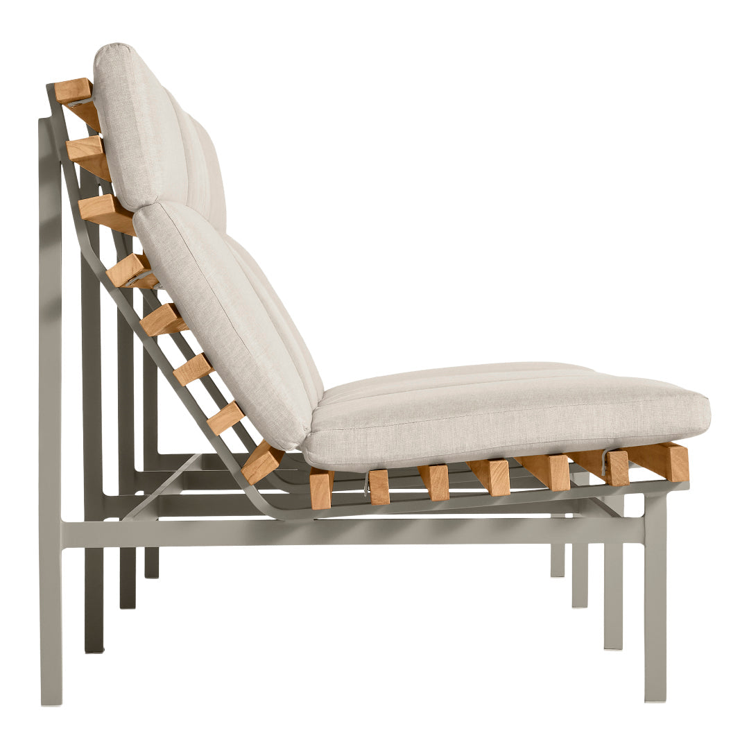 The innovative construction features FSC ®-certified teak slats layered over a lightweight, corrosion-resistant aluminum frame available in sophisticated matte white or contemporary grey. This thoughtful material combination achieves remarkable visual lightness while delivering substantial durability for years of outdoor enjoyment. The rectangular teak elements introduce natural warmth that develops a distinguished silver-grey patina over time, creating a piece that evolves beautifully with your landscape.