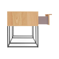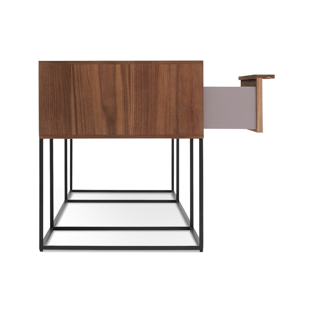 Engineered wood with veneers and powder-coated steel base. Unfinished wood back.