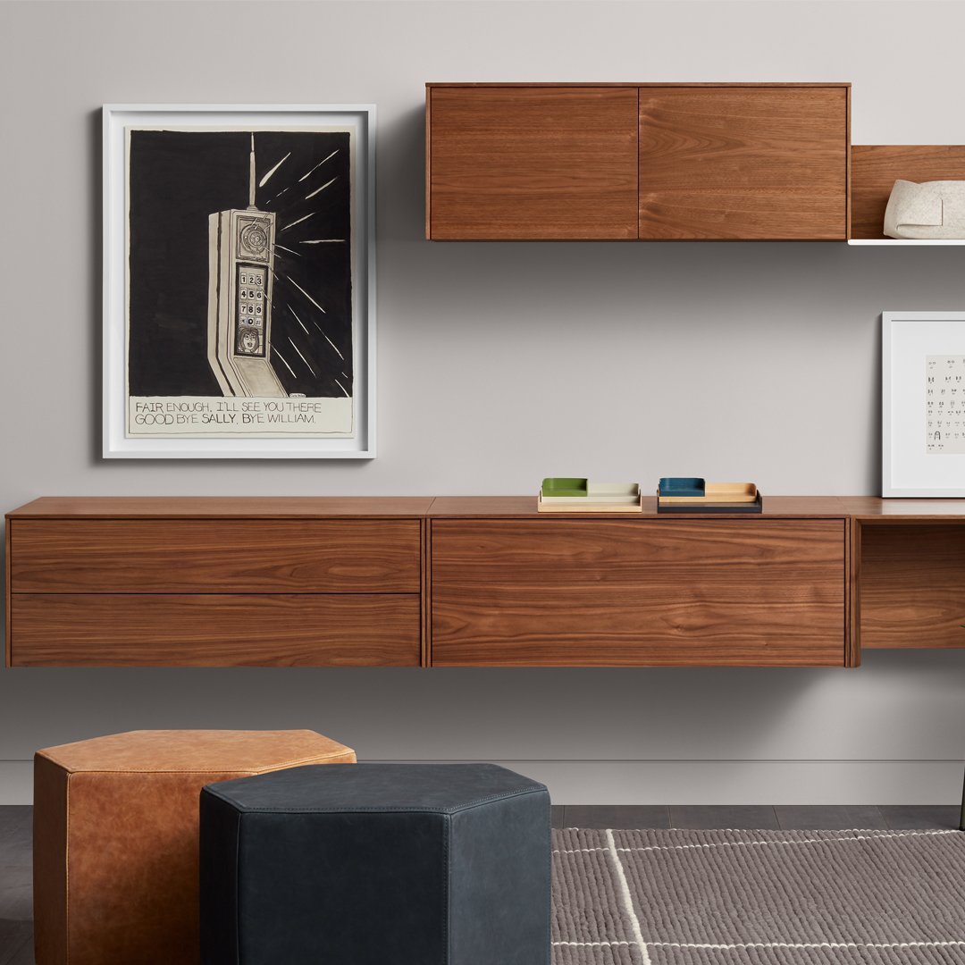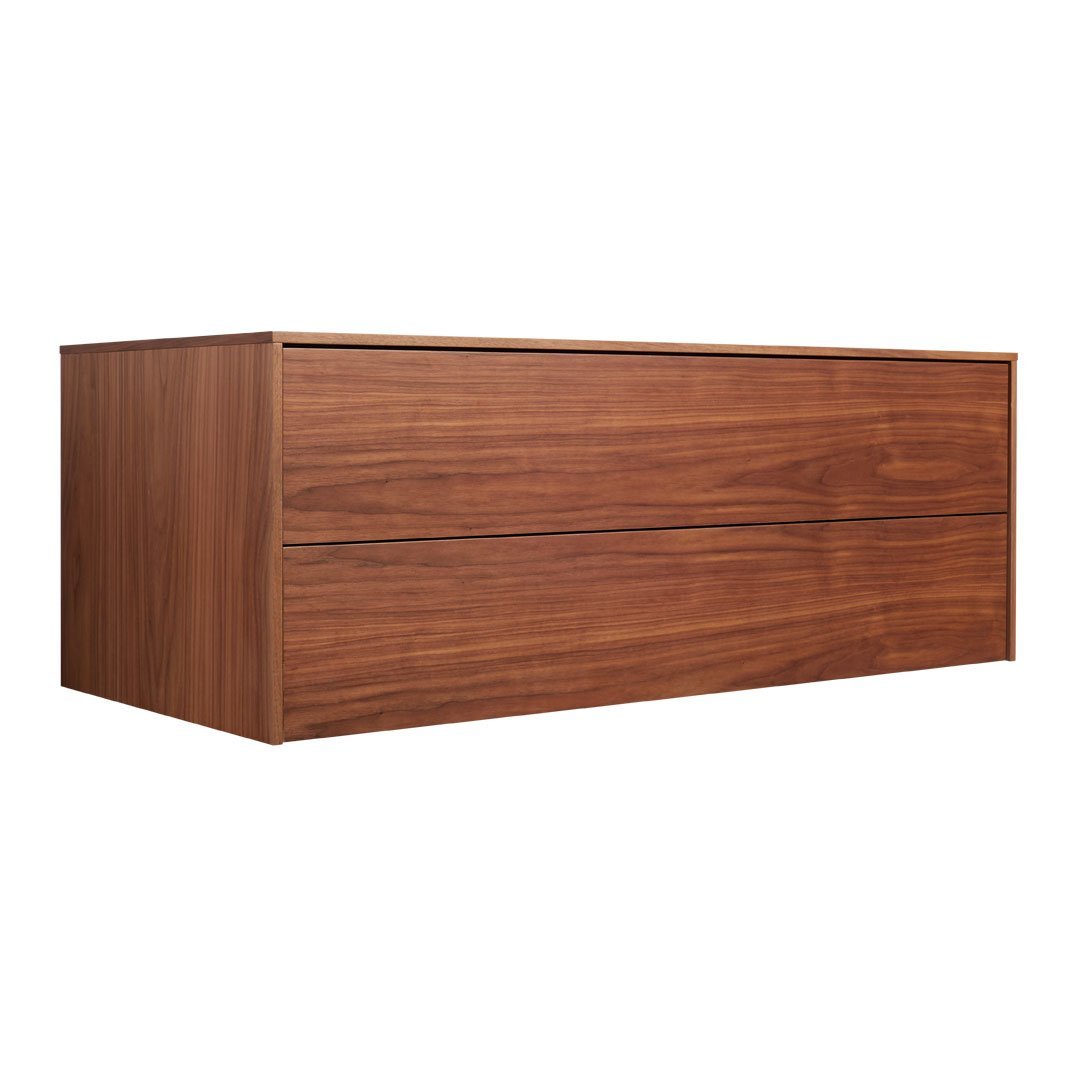 Wall-mounted two-drawer cabinet maximizes functional storage and provides a custom-looking solution without the hassle of finding someone to build it. In walnut with push latch drawers. Pair with companion door desk and shelf units to create a full-on storage masterpiece.