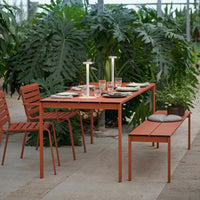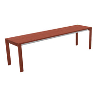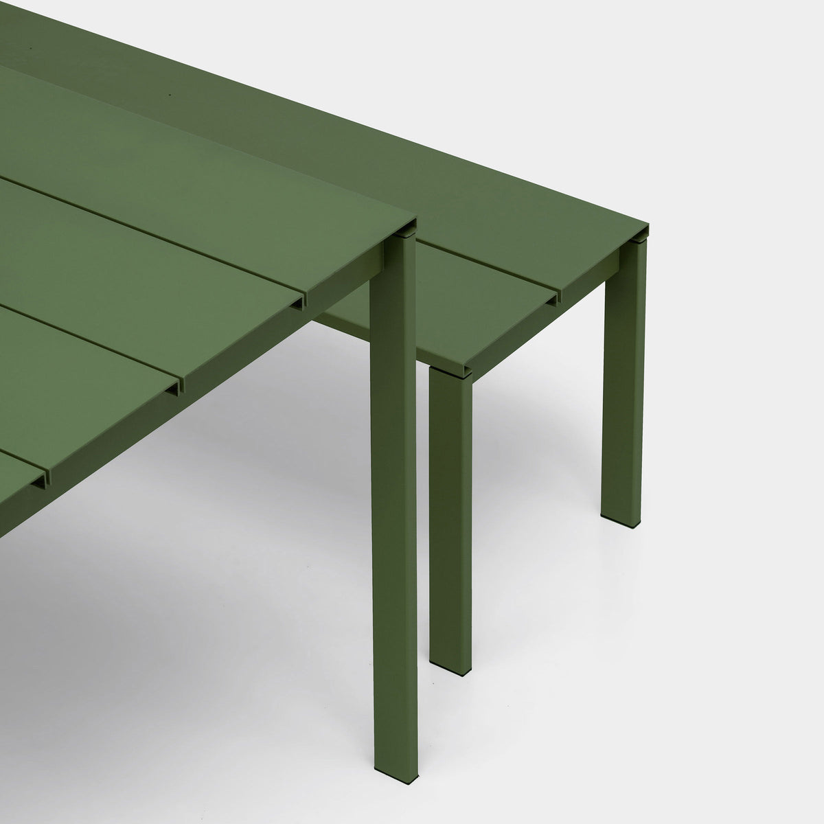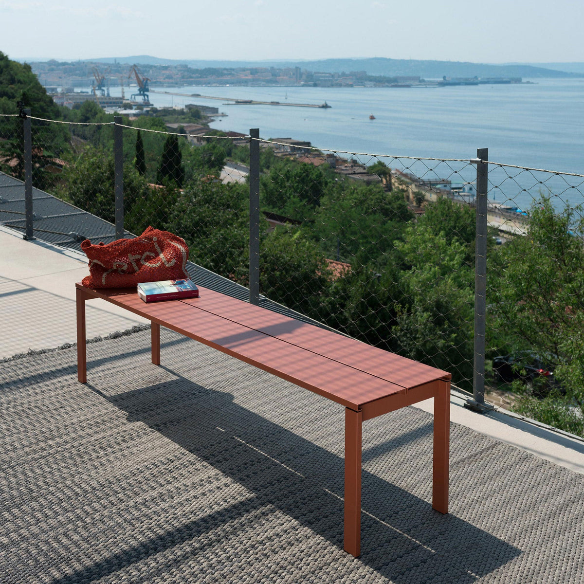 A complete collection of tables, benches and small tables for outdoor use, including a bar table or bar counter, in a simple versatile design, with crosspieces made of anodised aluminium. It has zinc-coated steel or powder-coated steel legs, also available in customised heights. The slatted top is available in teak, aluminium and new Argilla finish.
