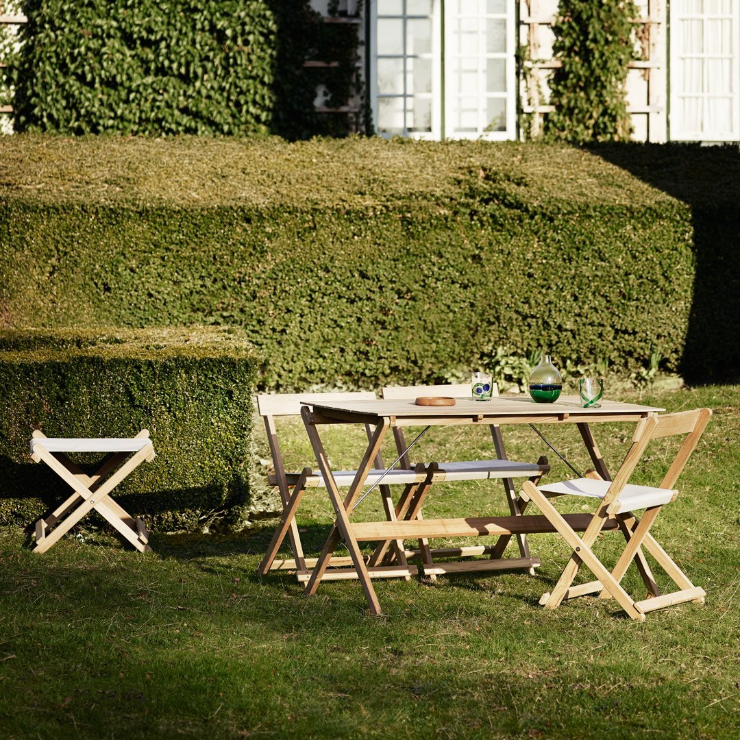 Perfectly proportioned to match the height of the series’ deck chair, the suspended seat of the foldable BM5768 Footstool is upholstered in weatherproof Sunbrella fabric, chosen for its natural look and easy cleaning. Can ideally be parred with BM1069 tray in solid Teak to create an inviting outdoor table.